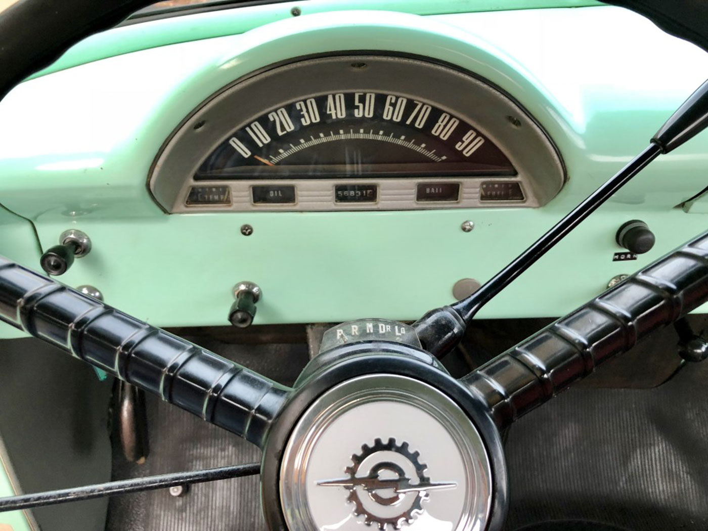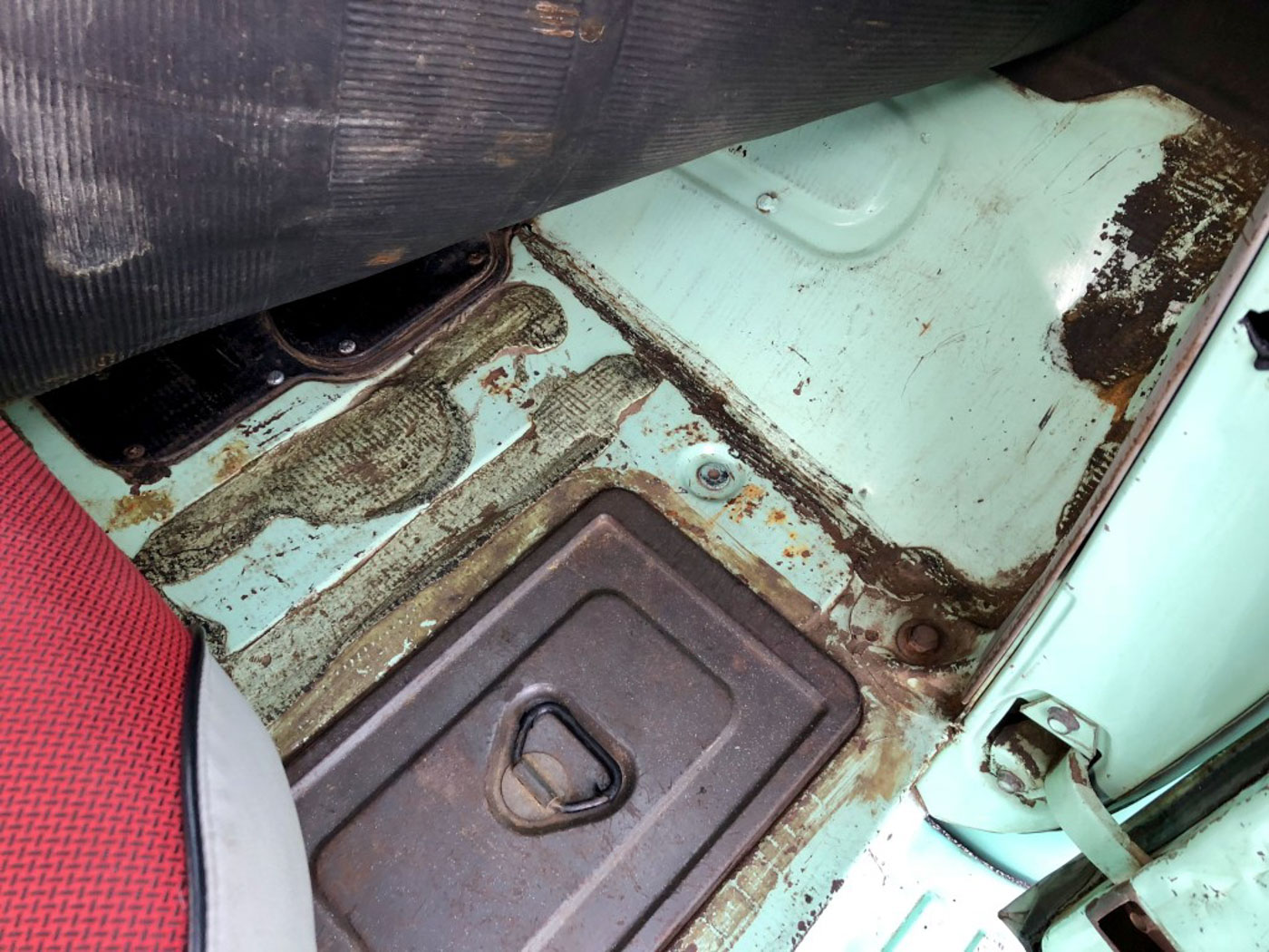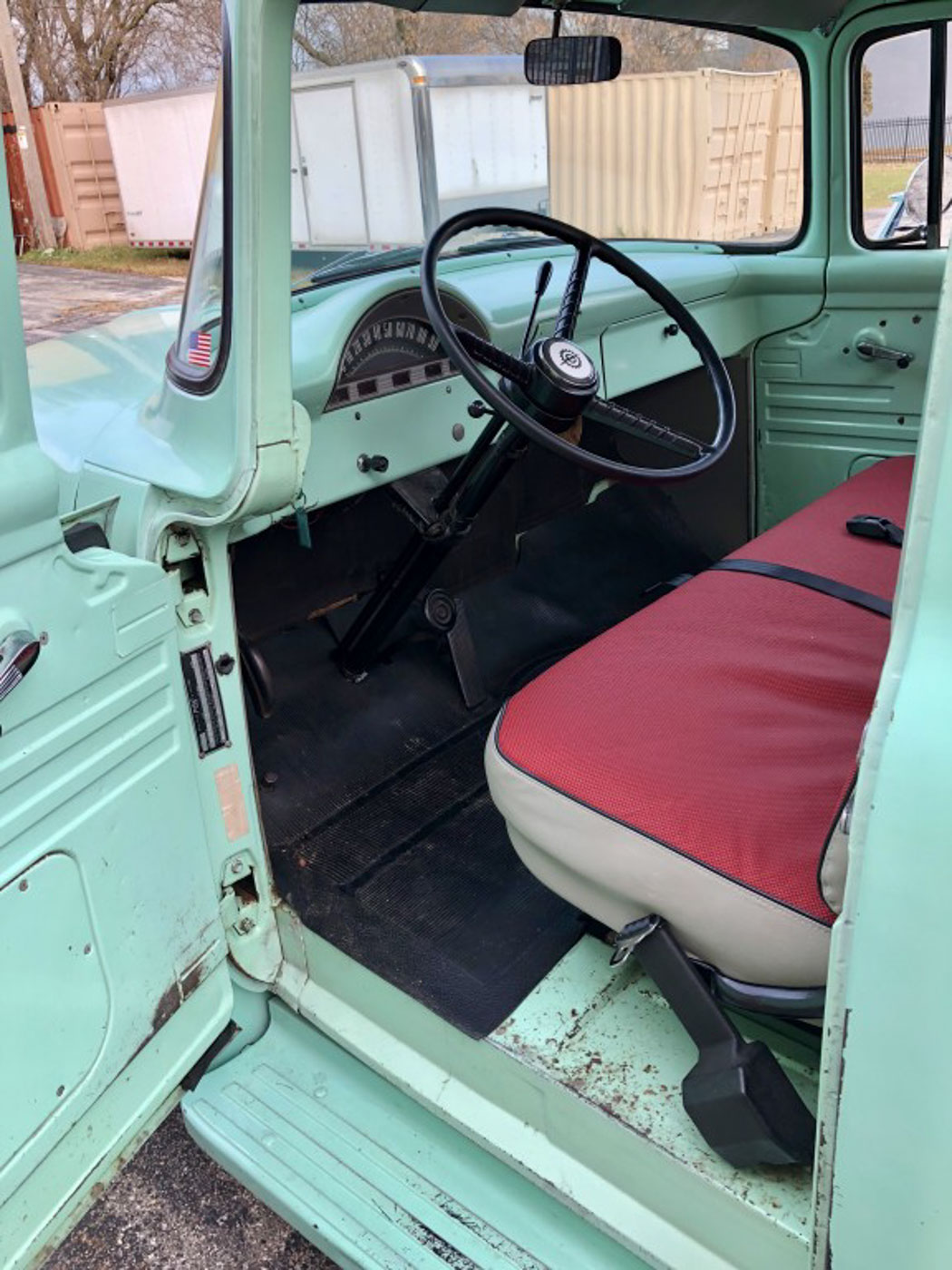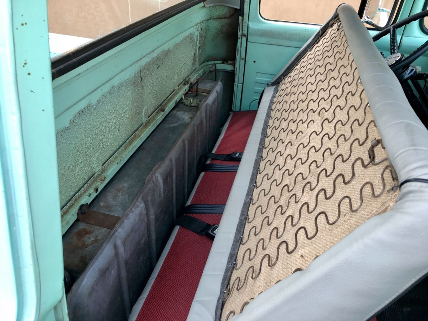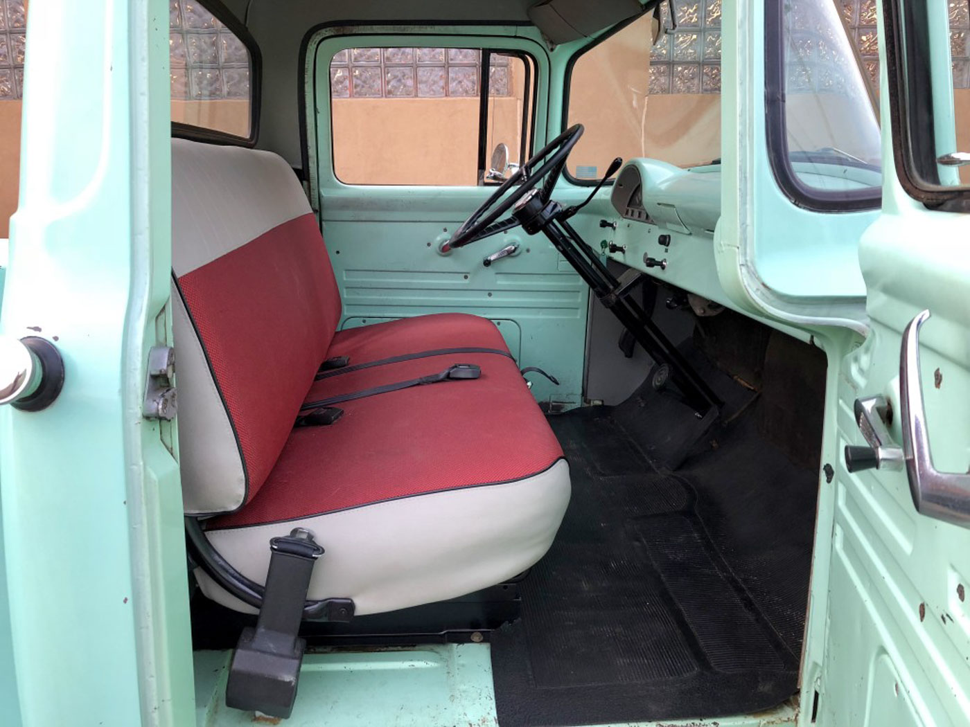 On the inside this heater delete and radio delete rig needed no more than recovering its original bench seat in damn near unobtainium NOS red and grey upholstery, sourced and carefully sewn together in the exact correct pattern and with great care. The rubber floor mat its original and even the factory cardboard heater blanking plate is present under the dash. Oh, and we added three modern seat belts for safety.