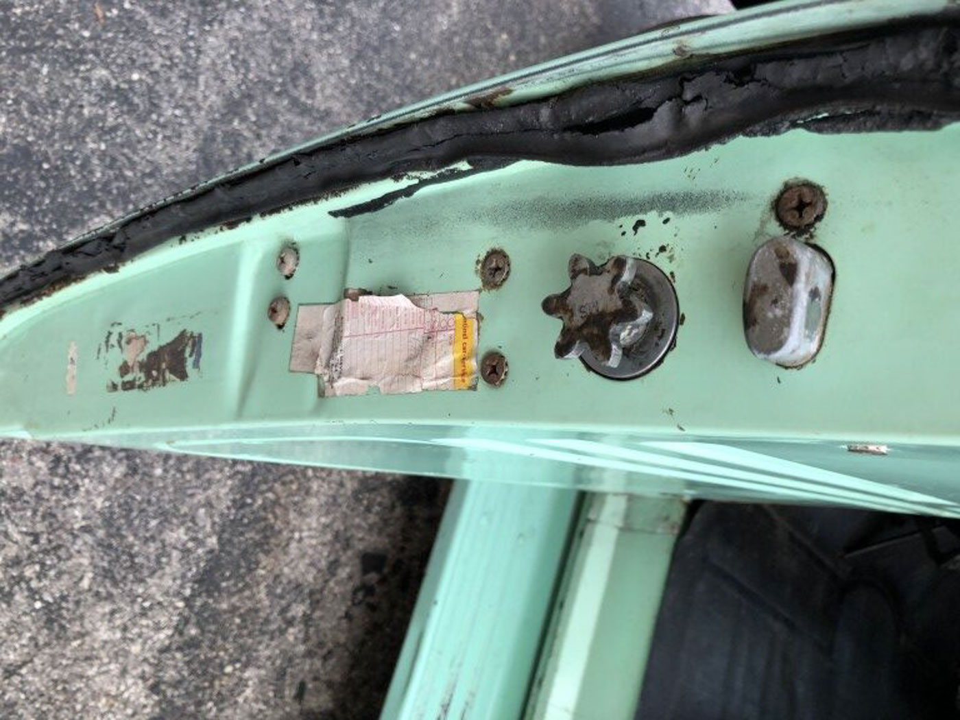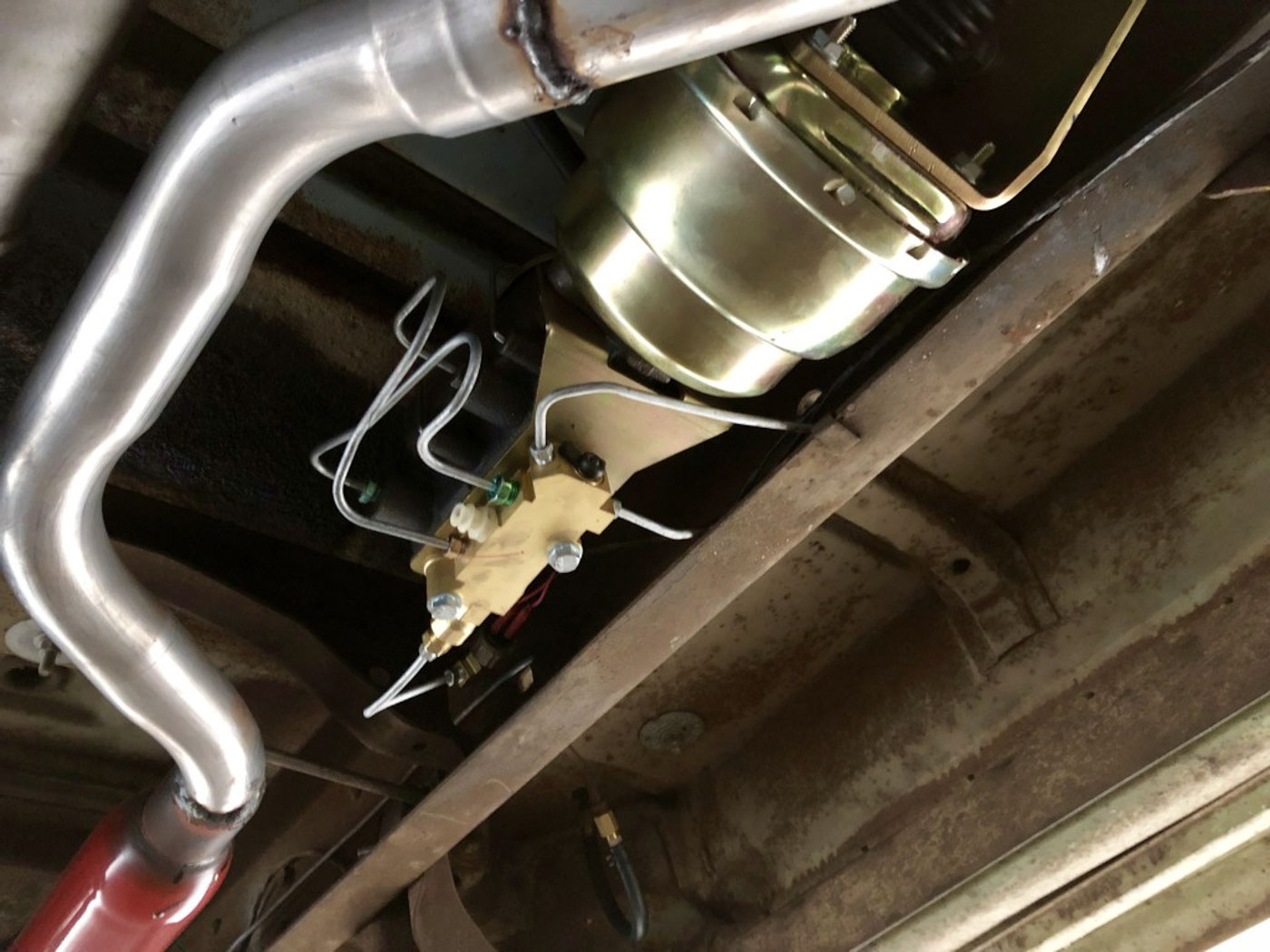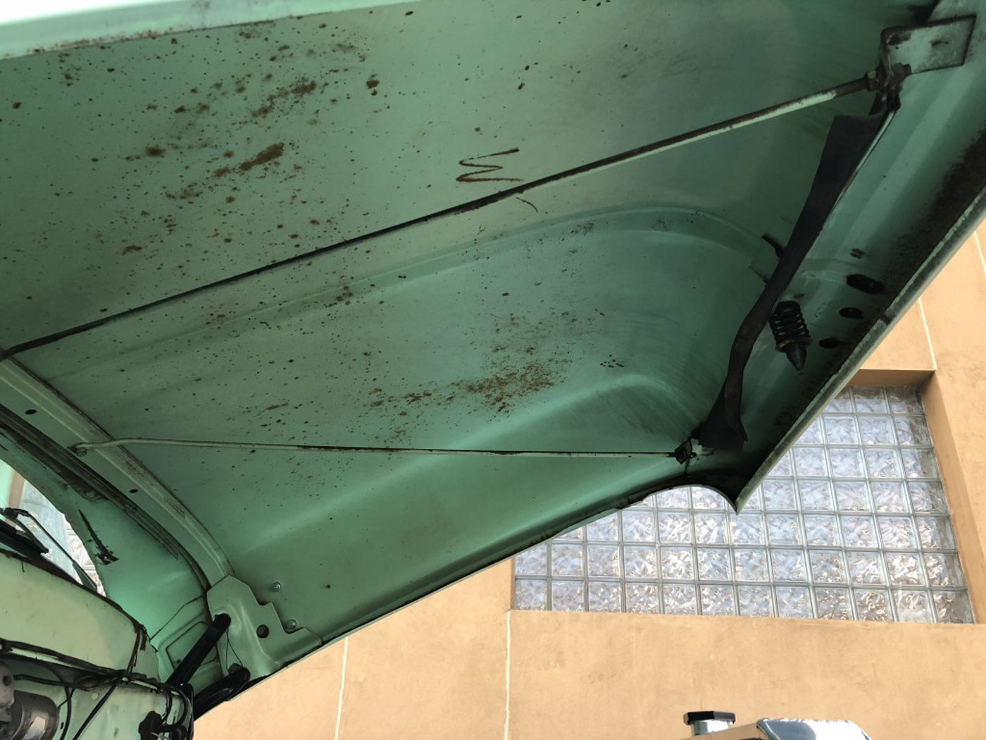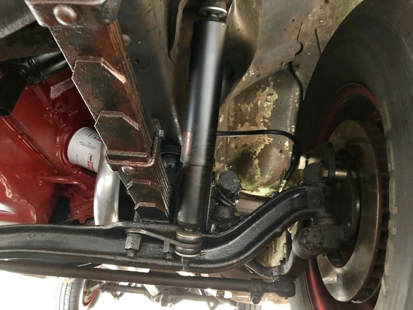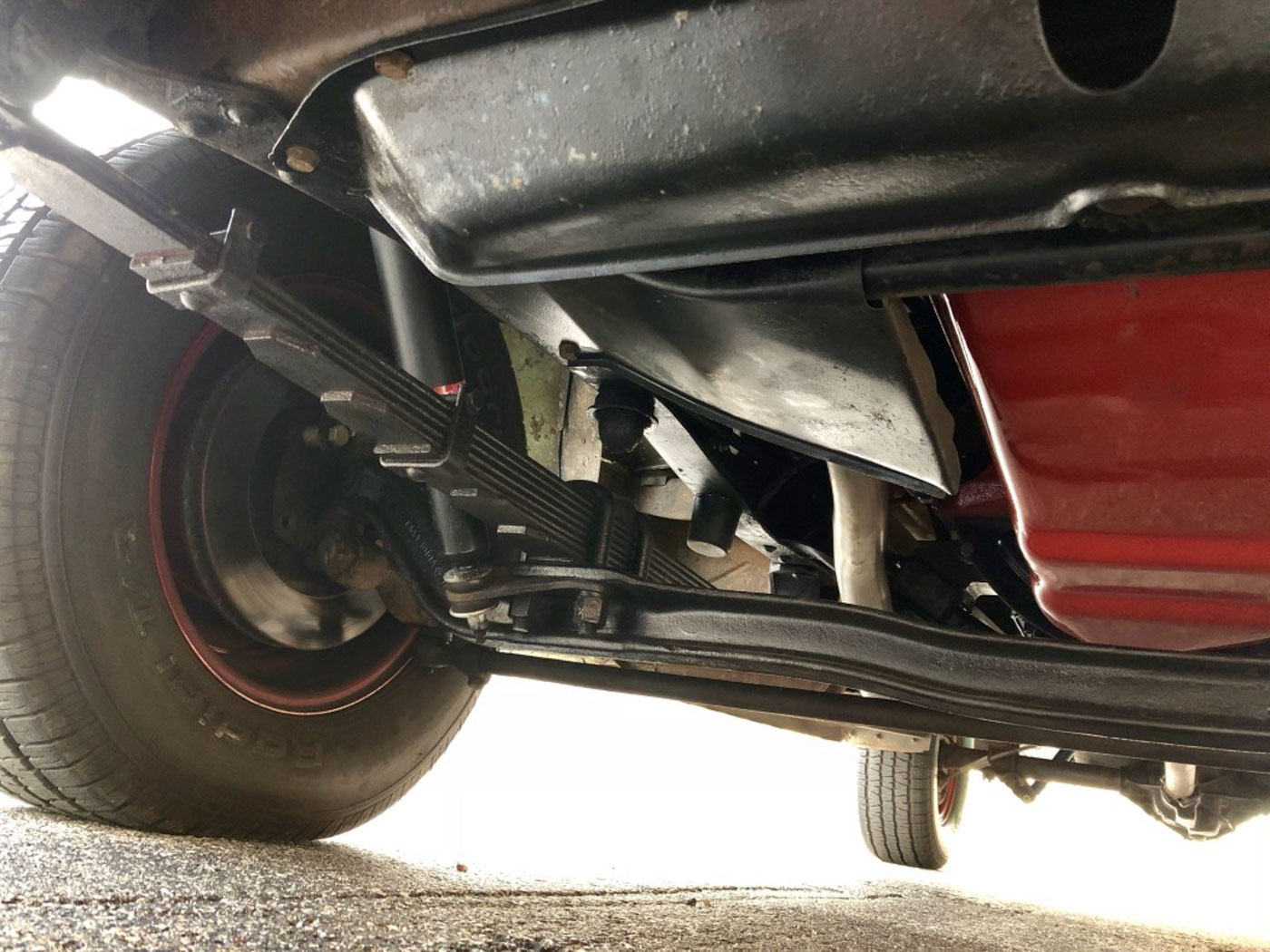 On the inside this heater delete and radio delete rig needed no more than recovering its original bench seat in damn near unobtainium NOS red and grey upholstery, sourced and carefully sewn together in the exact correct pattern and with great care. The rubber floor mat its original and even the factory cardboard heater blanking plate is present under the dash. Oh, and we added three modern seat belts for safety.