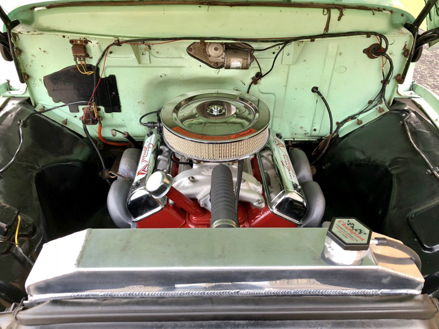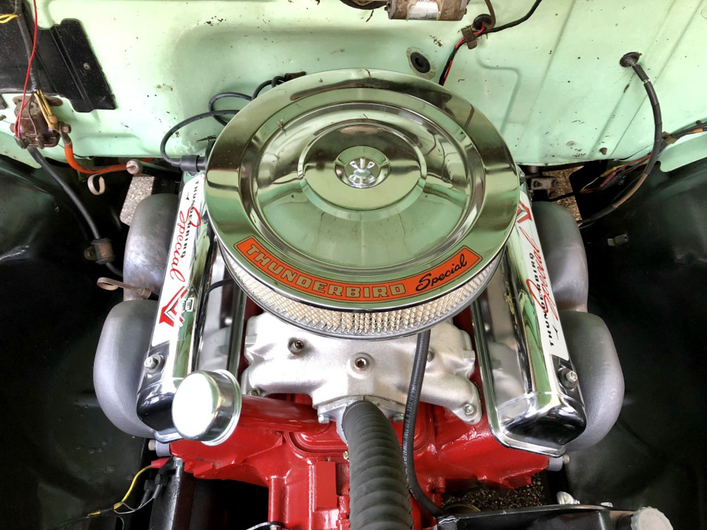 Of course, since the truck had been sitting for the better part of the last few decades it needed some serious mechanical help. Its original Y-Block’s cooling jackets were filled with sludge and rust and the fuel tank filled with acorns. Yes, acorns. How? I have no idea. So we yanked the truck apart and are built it into a period-style mild “hot rod” with a few added tweaks. The original Y-Block was bored out to a 312″, had its oiling system modified to fix the Achilles heel of these things, stuffed with a hotter solid lifter cam, and topped with a Mummert aluminum dual plane intake and a Holley 4 barrel carb. It exhales through beautiful cast iron “rams horn” headers and a custom dual exhaust with proper Cherry Bomb glasspacks for that true period sound. The original Ford-O-Matic was completely rebuilt, the driveshaft balanced, and everything else that moves serviced to perfection. A hidden power front disc brake conversion was added, as was a trick modern power steering setup that is almost invisible. New gas shocks were put on all four corners, as well as all new suspension bushings throughout. A custom aluminum radiator keeps it all cool, and a staggered “big n’ little” 15″ wheel and radial tire setup keeps it all on the road. The transformation in the way this F100 drives is quite amazing if I do say so myself. It no longer drives, or stops and steers, like a truck! Better yet is how it performs. That hot rod Y-Block just gets it now. This is one quick old truck, and it does it all without a modern powerplant but rather its original motor that was built right.