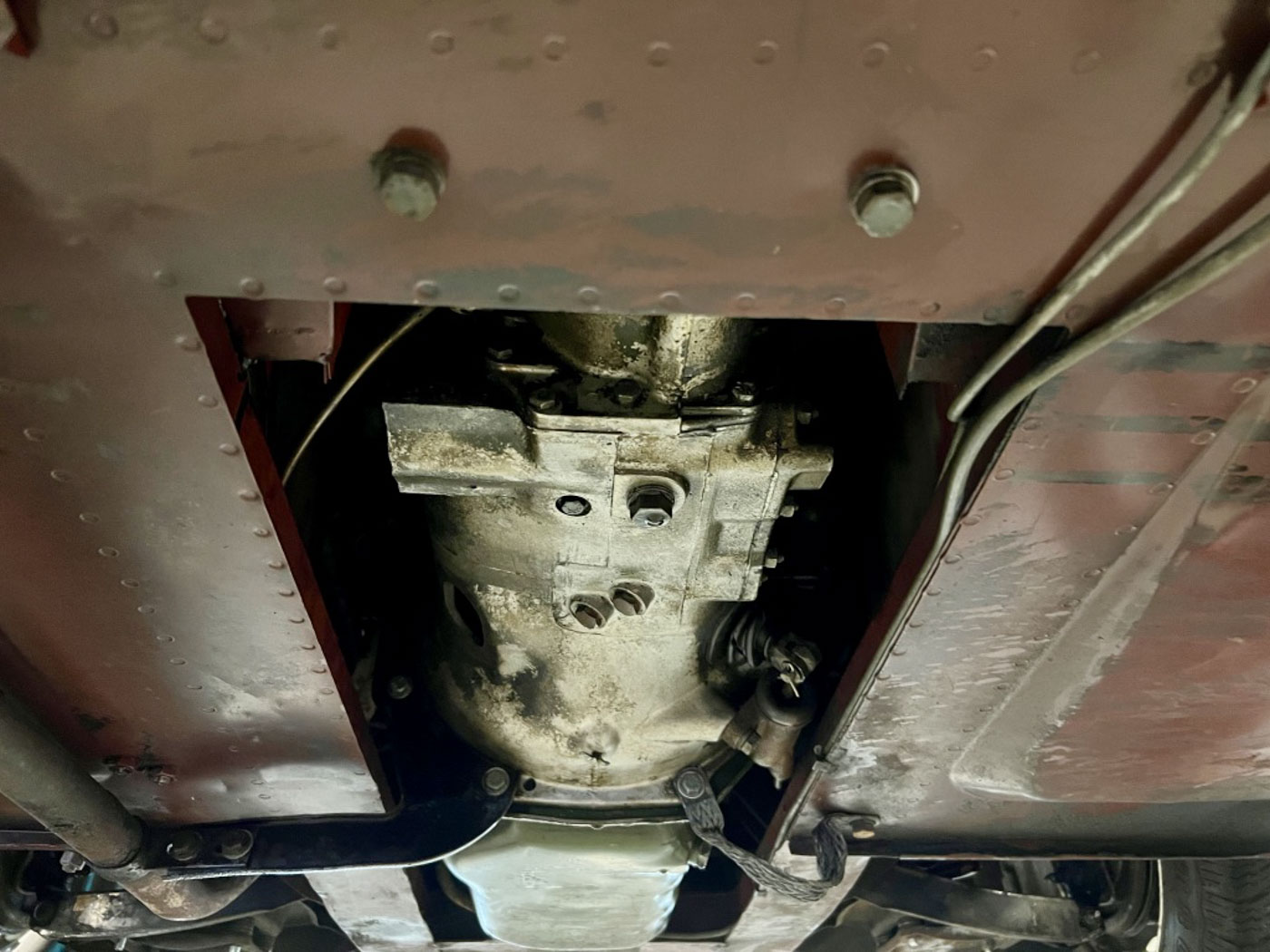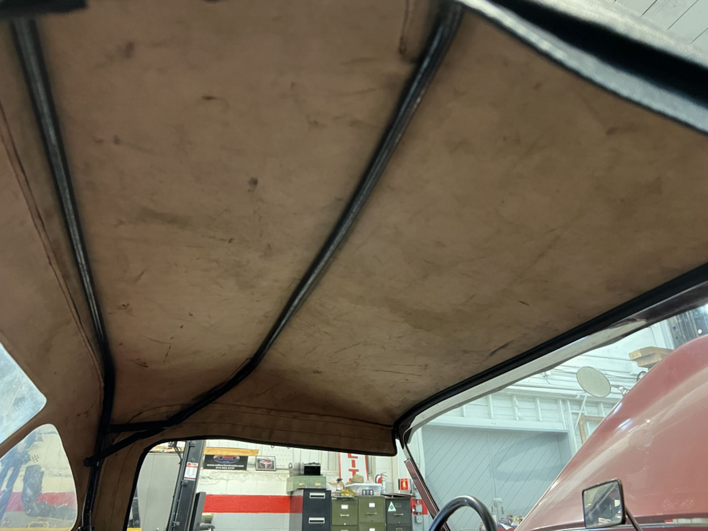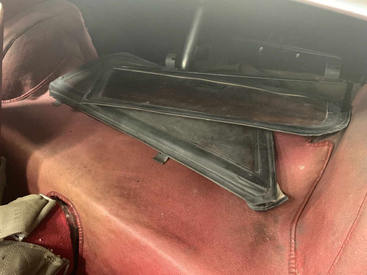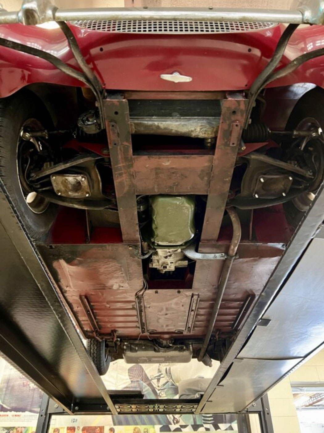 There is absolutely ZERO rust or corrosion anywhere, nor are there any prior bumps or bruises on its incredibly well preserved body. Check out the chassis photos- that’s all factory Cherry Red paint throughout. It has an excellent original ’58 convertible top with the “Lift-a-Dot” studs across the windshield header as well as original ’58 side curtains that are another hallmark of these special early production cars.