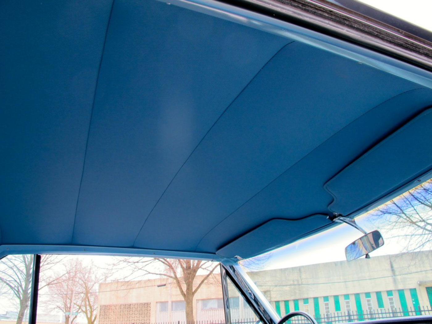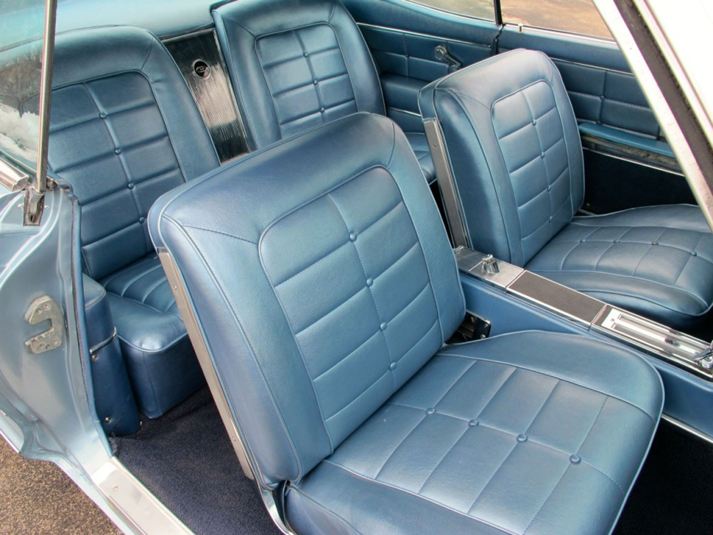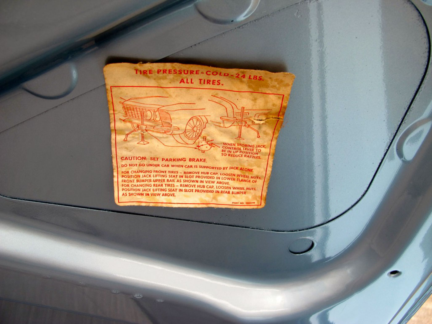 The interior is exceptional and has new seat foam and seat covers, a new correct headliner, recovered sun visors, and mint original door panels. The dash top pad has cracks in it and I installed a Coverlay dash topper. It looks very nice but obviously a concours judge or Riviera expert would spot it. All of the gauges and lights work as-new and the only item that doesn’t function perfectly is the original AM radio. It turns on and makes some noise through the speaker but no music. The dash aluminum is all great with the exception of one wrinkled corner on the glovebox door. All of the interior chrome is excellent. The trunk has a new correct trunk mat and spare tire cover from Clark’s along with the original jack, tools, and spare.