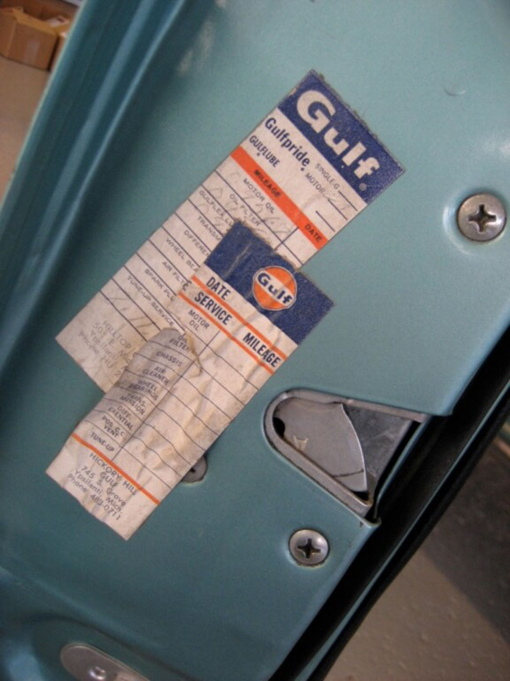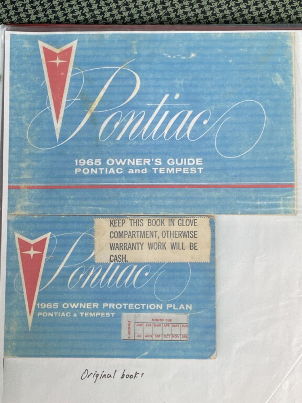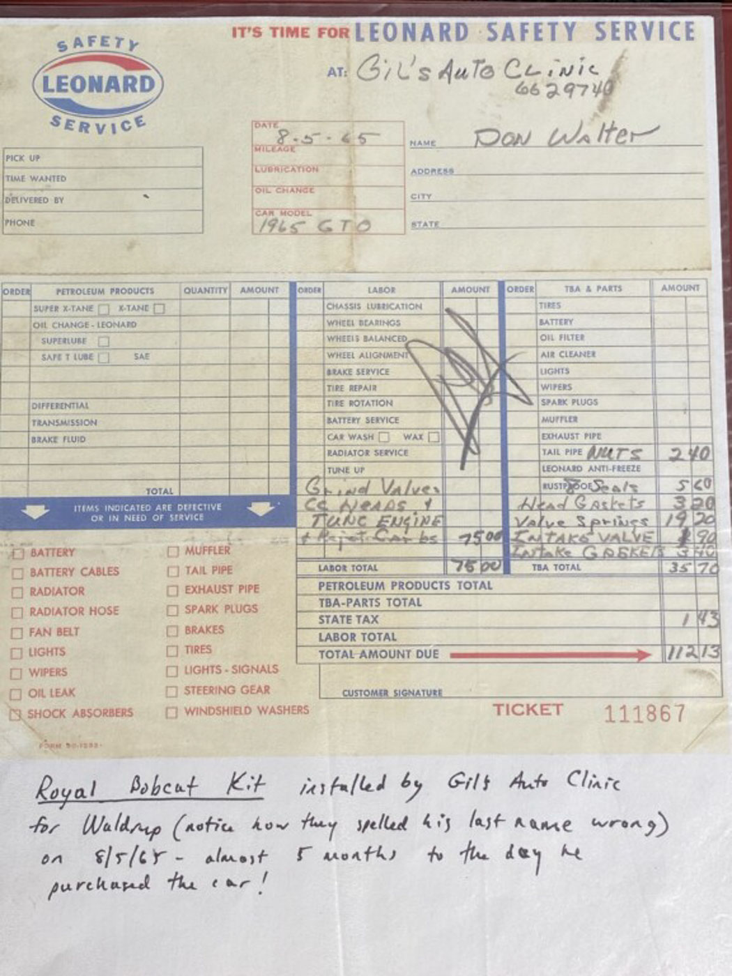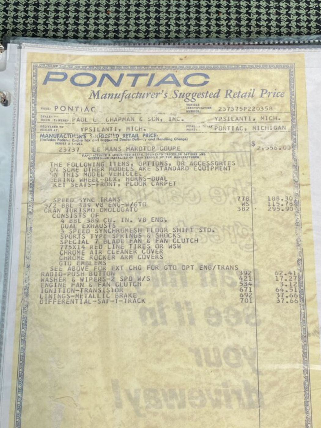 This is one of the coolest GTOs I’ve ever owned. With Scott Tiemann’s help I purchased this car from the son of the original owner in 2005. His dad special ordered it for street racing and was delivered to him new in the summer of ’65. The options are unreal, factory 3×2, TI ignition, close ratio M21 4 speed, 3.90 posi, metallic brakes, buckets with no console, no undercoat, no sound deadening etc. Within weeks of delivery he had a Bobcat Kit installed by Gil’s Auto Clinic- documented with the original receipt. I have a pic of the car at the drag strip after that, factory wheels up front, chrome reverse rims with drag slicks on the back. He then went to Vietnam, came home, then went back for another tour. When he returned again it was family time. As a result the GTO had sat in his garage, near Detroit, since 1970 or so. At the time it had just turned 15,000 miles from new.