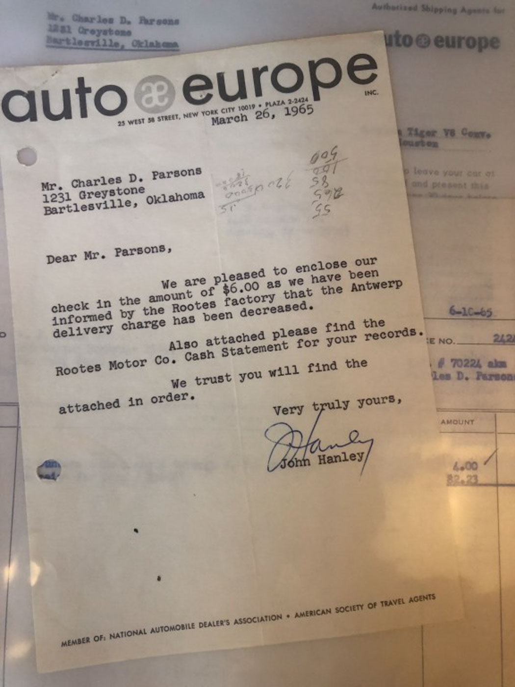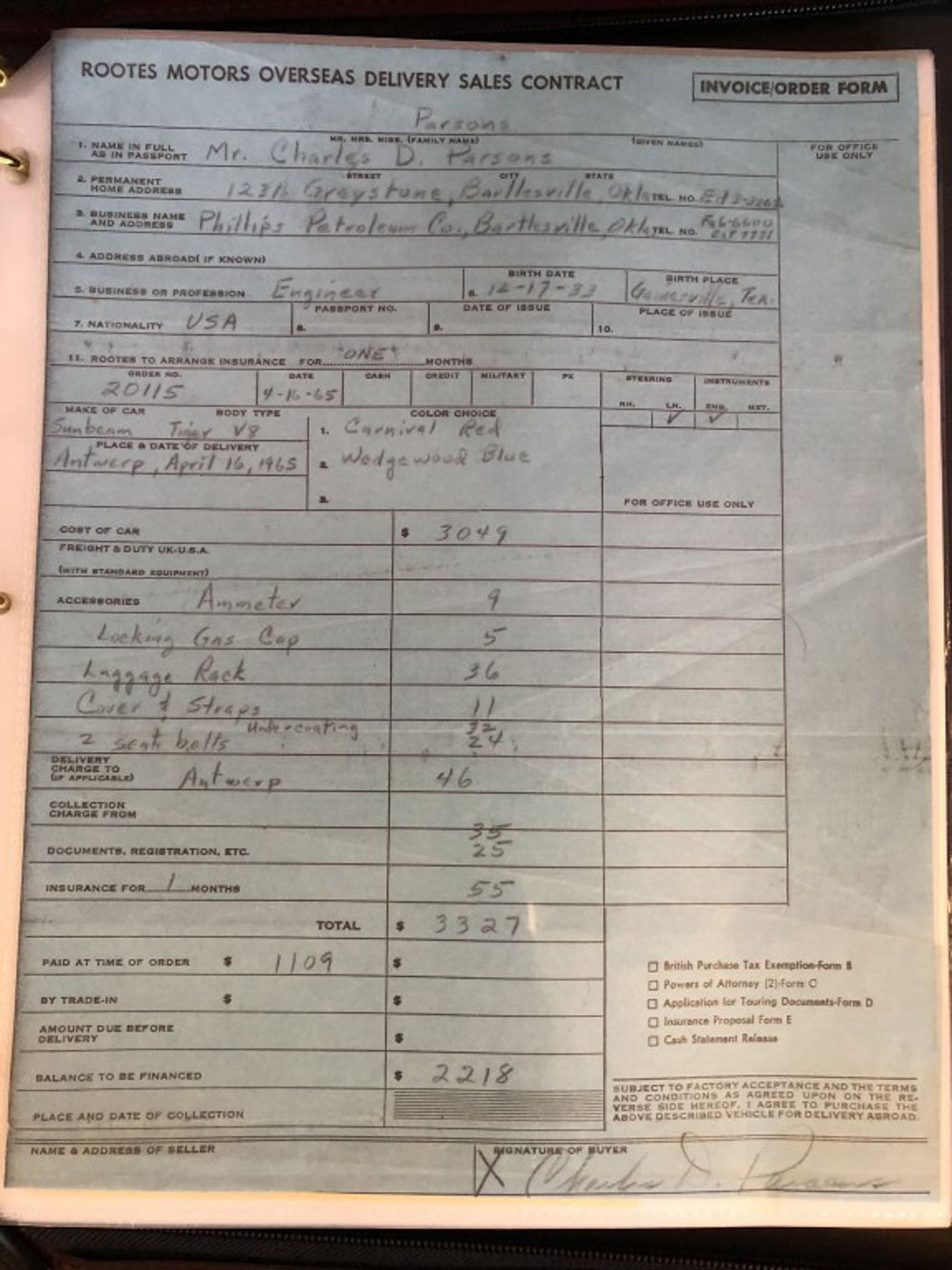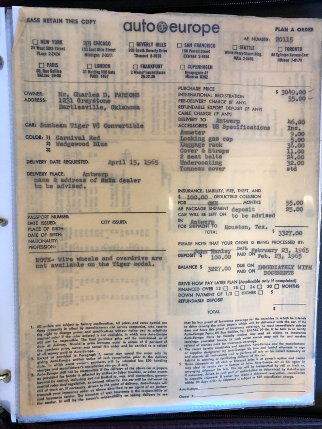 On February 23rd 1965 a then-31-year old Charlie Parsons of Oklahoma City OK specially ordered a brand new 1965 Sunbeam Tiger from Auto Europe in Chicago. Why Auto Europe? Because Charlie planned to accept delivery of his new Tiger in Antwerp, Belgium where he would then spend the next few weeks getting to know his new Ford-powered British sports car on the vacation of a lifetime.