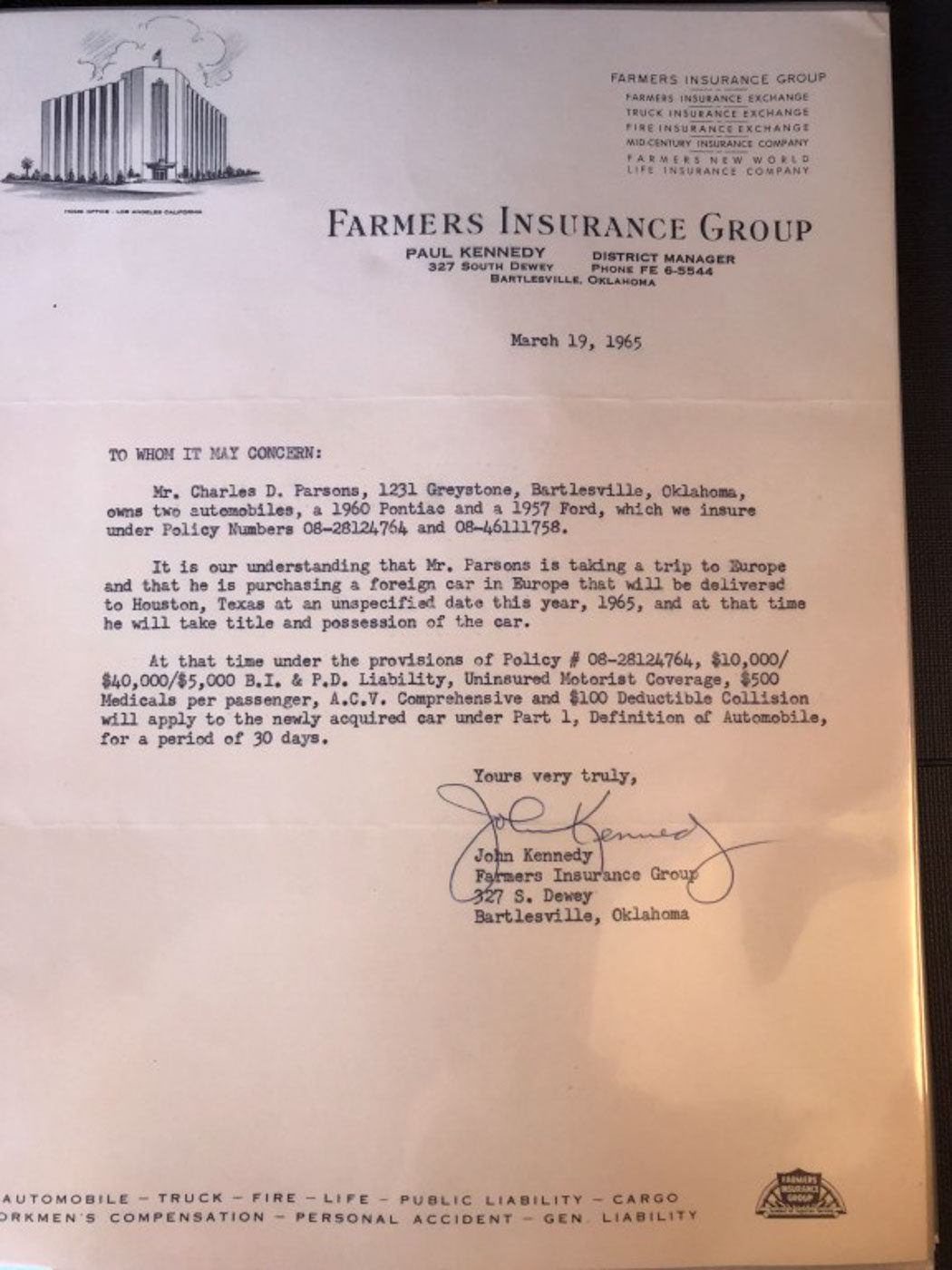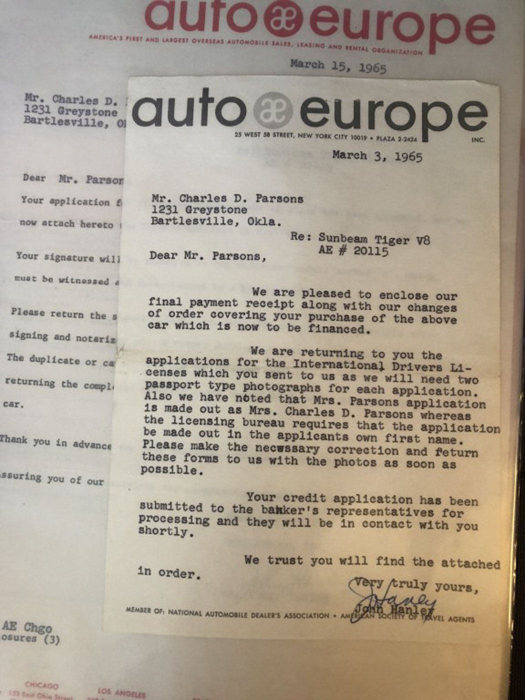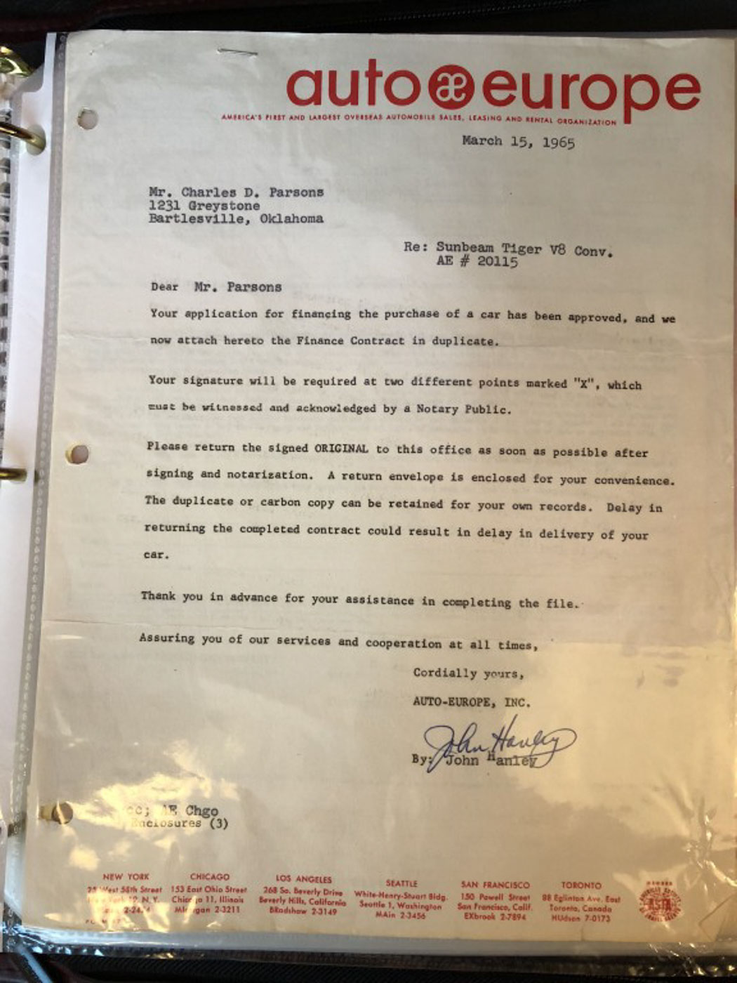 On February 23rd 1965 a then-31-year old Charlie Parsons of Oklahoma City OK specially ordered a brand new 1965 Sunbeam Tiger from Auto Europe in Chicago. Why Auto Europe? Because Charlie planned to accept delivery of his new Tiger in Antwerp, Belgium where he would then spend the next few weeks getting to know his new Ford-powered British sports car on the vacation of a lifetime.