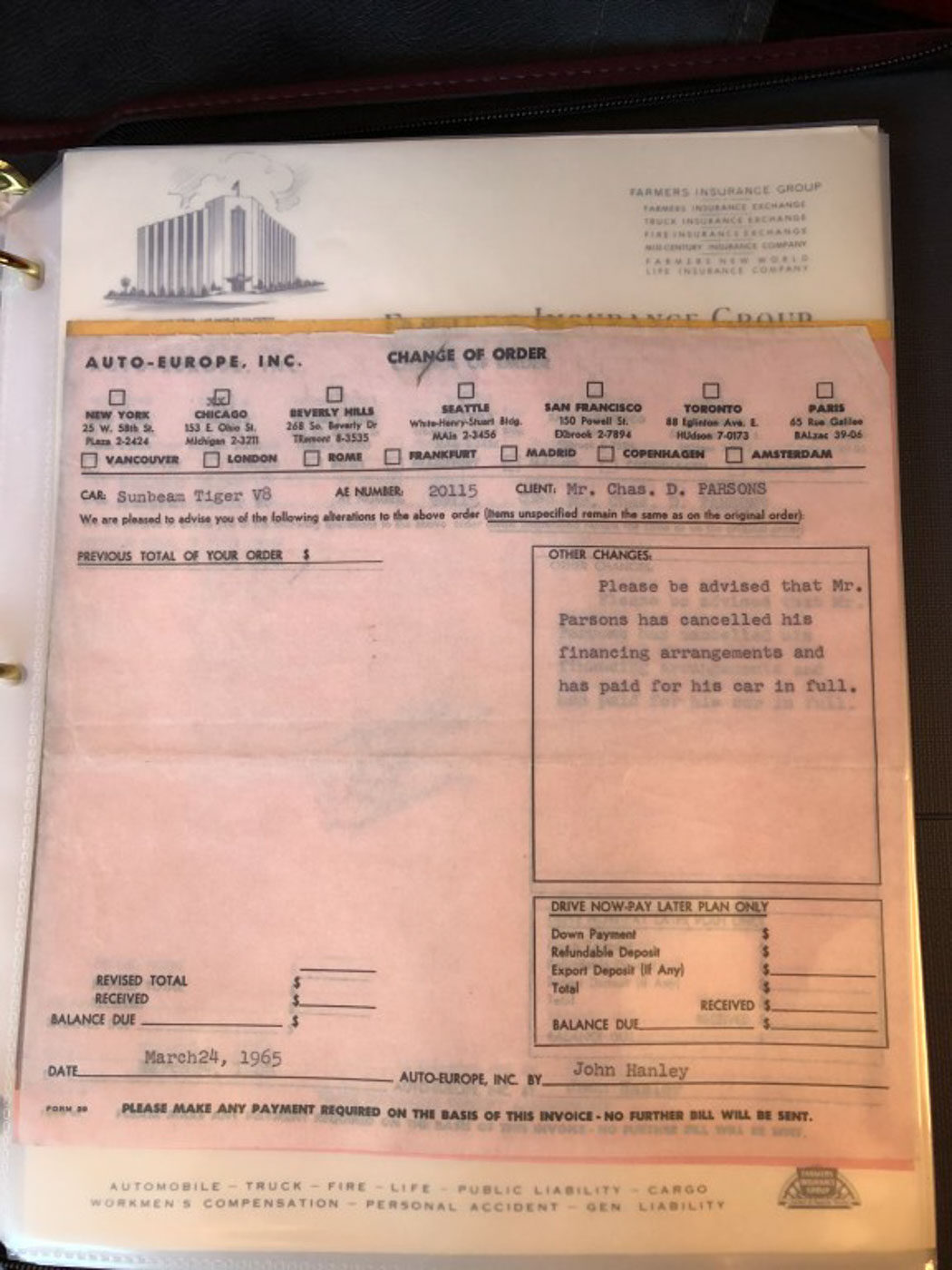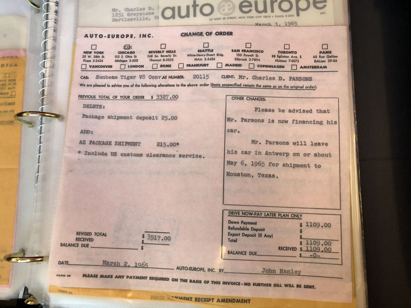 Once home from Europe Charlie’s Tiger saw limited use over the following decades, a total of 22,000 miles by 2014 to be exact. But it is clear the Tiger never saw a limited amount of care. After Charlie’s passing his family sold his Tiger, still in virtually new condition, with even its original paint looking just like it did in 1965. Sure, it needed some servicing after years of sitting under a cover, but after all of that was done she now runs like new again as well. What is even more impressive is the amount of documentation Charlie saved from Day 1. It is unlikely a more organized or comprehensive collection of documents for any old car exists- Charlie even saved the envelopes! The story this thick, meticulously organized binder of documentation tells is simply fascinating.