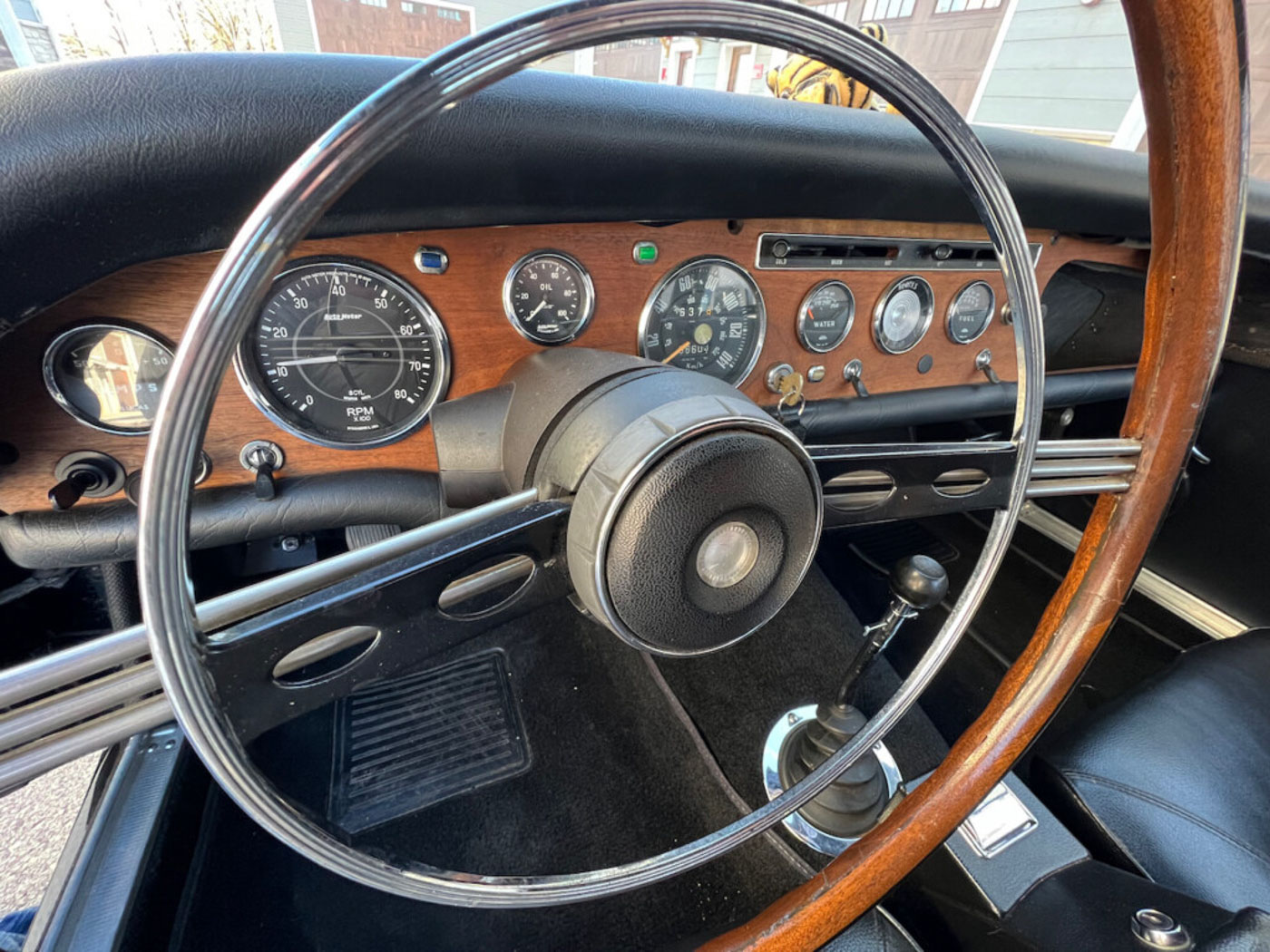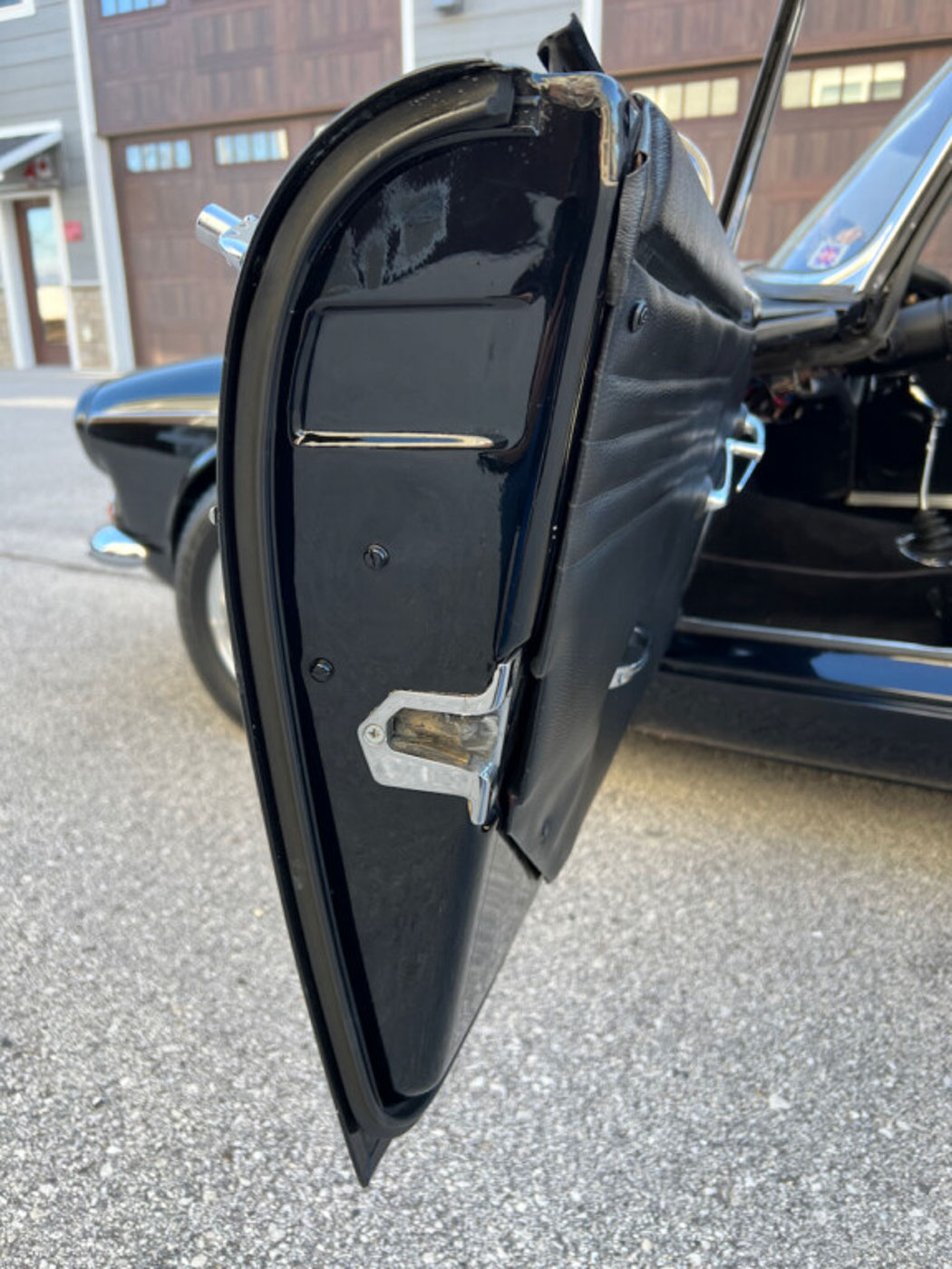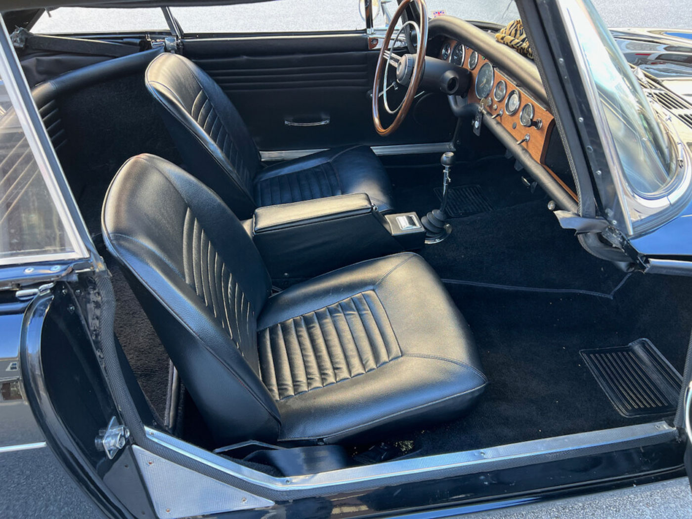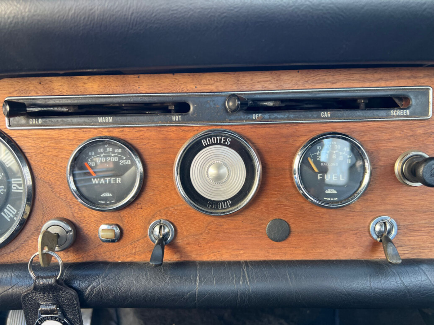 The body is super straight and solid with no signs of any rust. While it left the factory in white it was painted black many years ago, and also has the LAT style hood as you can see. It has both the factory optional hardtop as well as a newer black soft top. On the inside it is all nice and tidy stock Tiger fare with all original upholstery, new carpet, and an upgraded tach (to meet the capabilities of the easy-revving roller engine) and an upgraded temp gauge (for accuracy.) Both original gauges are included.