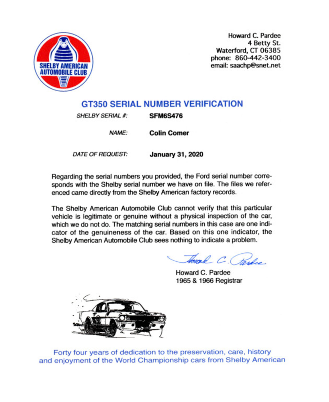 Below is the history footnote of 6S476 from the current SAAC Registry, provided by the 1965-1966 Registrar Howard Pardee: