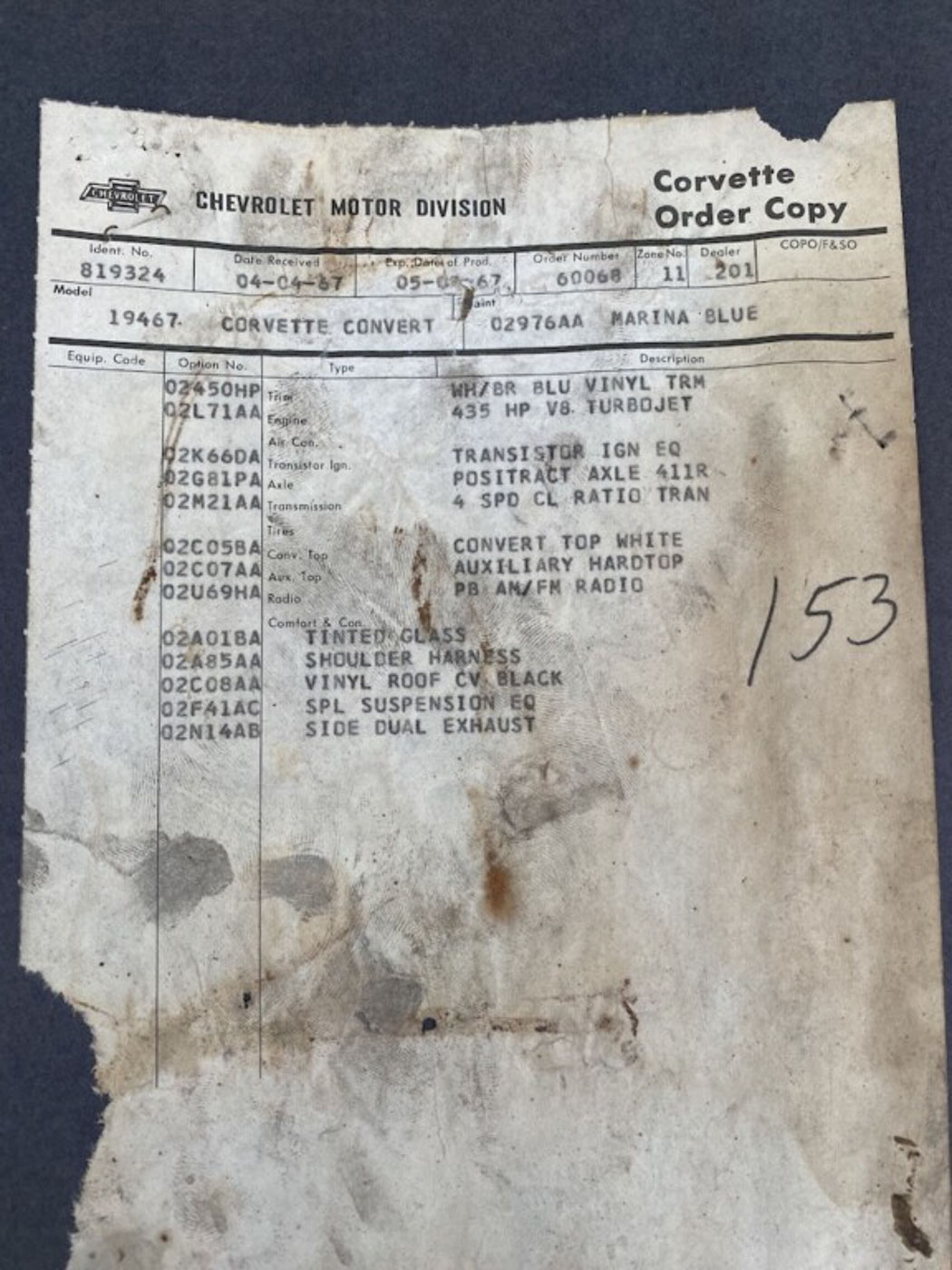 Of course all of these are documented as original on this cars original factory tank sticker. Built on May 10th, 1967 and quickly sold to its first owner, by the end of 1967 the original short block failed and was replaced under warranty with a real factory 3916321 “CE” warranty block dated Sept. 11 1967. GM fitted this short block under warranty retaining the car’s original March 18th 1967 dated cylinder heads, original intake, and carburetors which the car retains to this day. The M21 transmission is also factory original, dated March 27th 1967, and sports the proper factory VIN stamp as well. A complete list of all other date codes and part numbers is available of course, and all are correct and original for this car.
