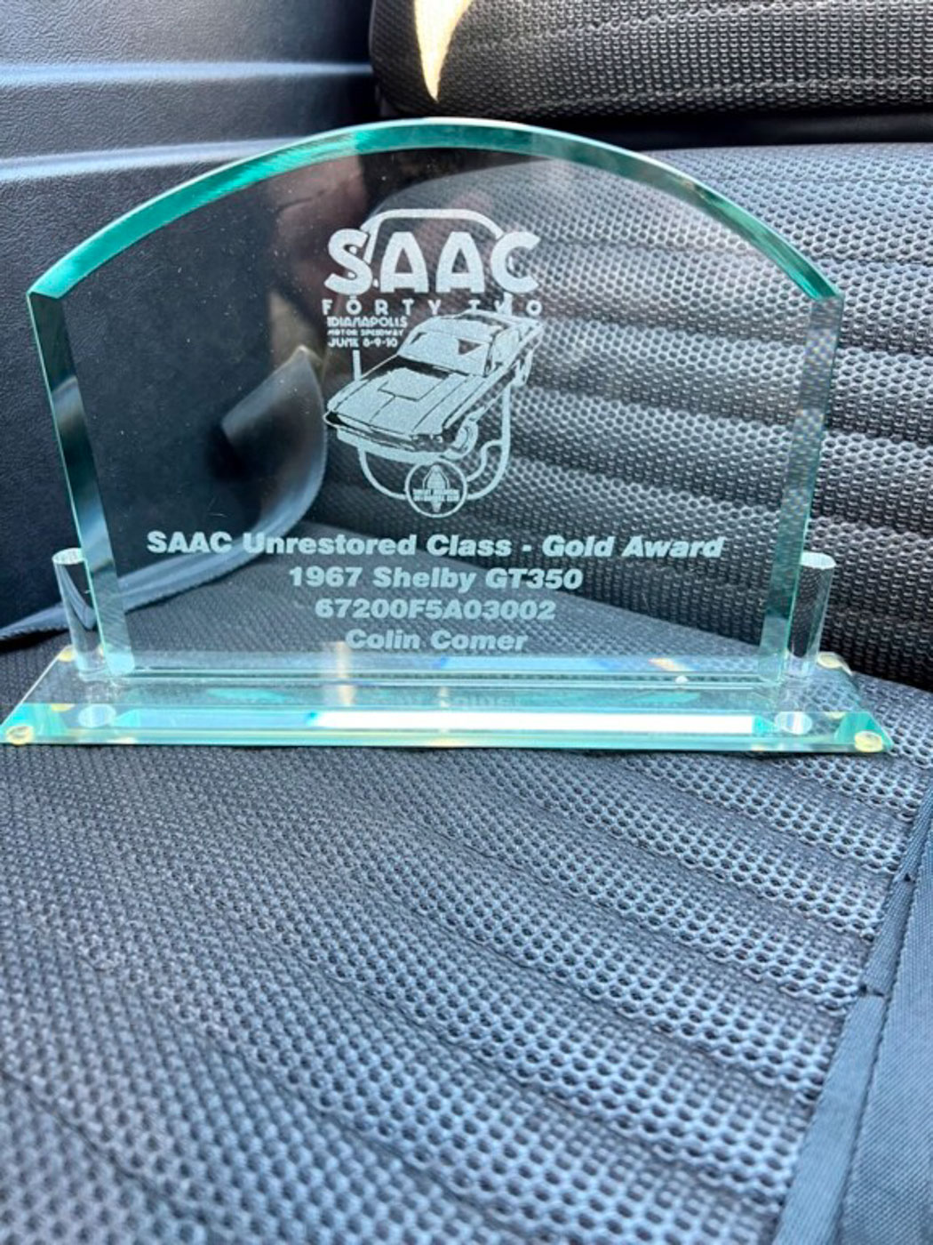 In June 2017 I brought 3002 to SAAC-42 and entered it in the judged concours. When the dust settled she emerged with a coveted Concours Gold Survivor award- which means this original unrestored car was judged against the same standard a restored car would be. 3002 has also won a Heritage Concours award at the national Team Shelby meet. Additionally it has been featured in my Shelby Mustang Fifty Years book and my new Shelby American Sixty Years of High Performance book.