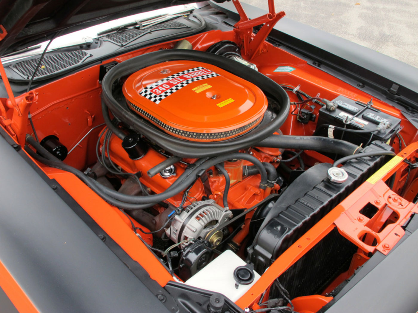 It unrestored with the exception of one very high quality repaint and engine compartment detailing of a superior quality original car. It does have a factory warranty replacement block that was really installed under warranty in 1970 with the warranty tag still riveted on the side. Blank VIN pad, correct (warranty) date code, real TA casting block inspected in person and confirmed in writing by Galen Govier as the real deal. Original numbers matching transmission and 3.91:1 rear. Of course it also has all of its original factory fender tags and VIN tag as well. Everything on the engine is original, carburetors (just concours restored by Custom Rebuilt Carbs of NJ), air cleaner, distributor, exhaust manifolds, etc. Original sheetmetal, interior, even original factory installed exhaust (with replacement Chrysler 1975 dated mufflers installed in 1977) still in place. Original (not reproduction) tires. All original glass with the exception of the windshield which is a old (period) PPG replacement.