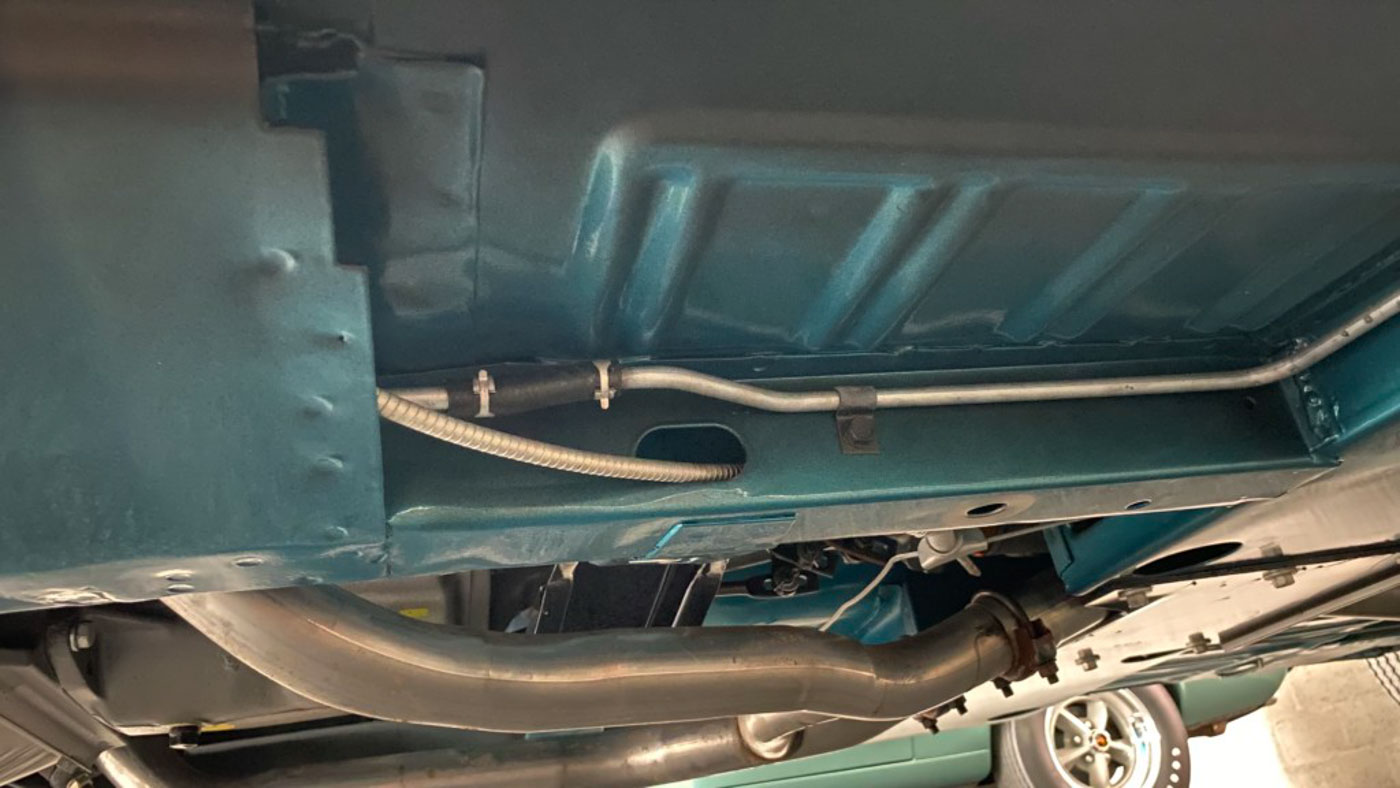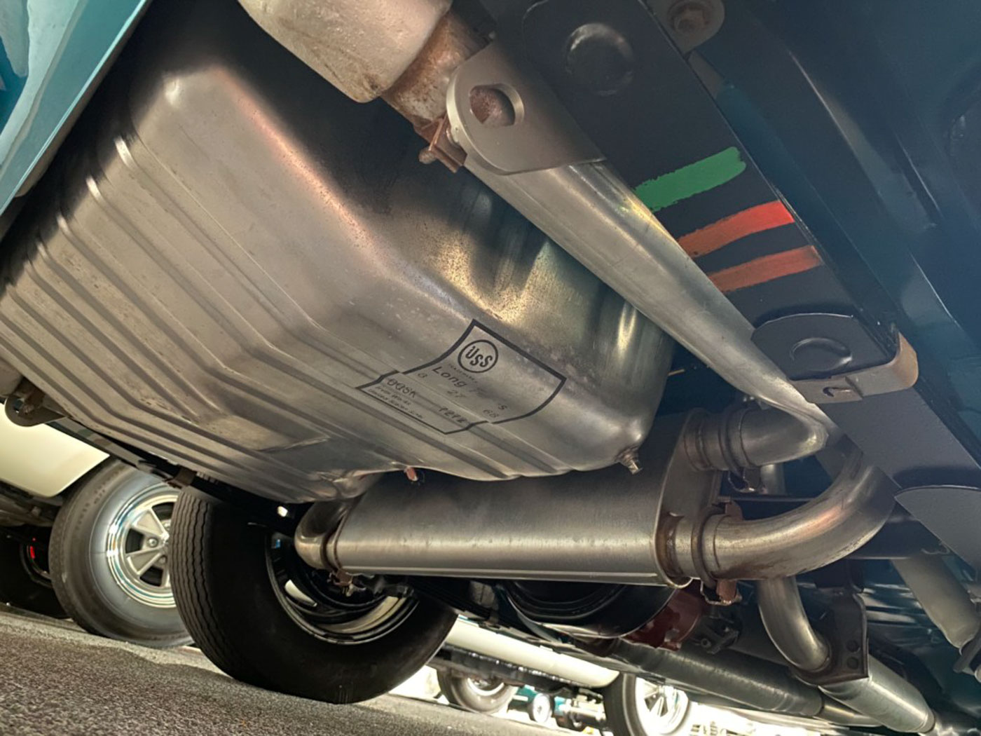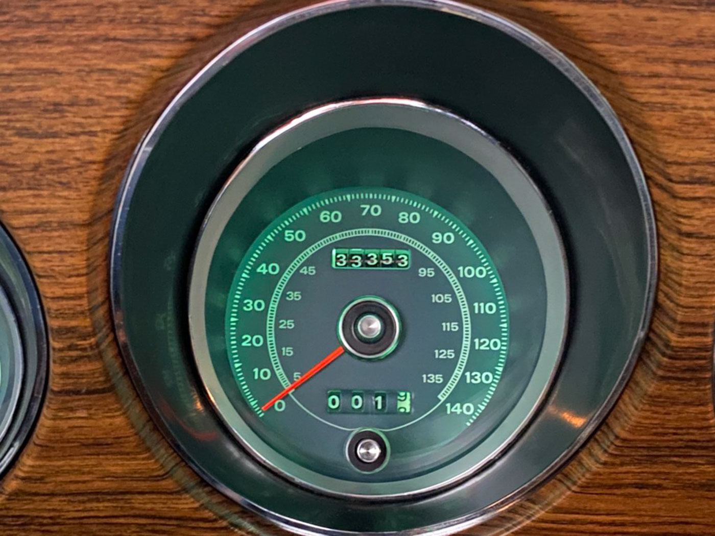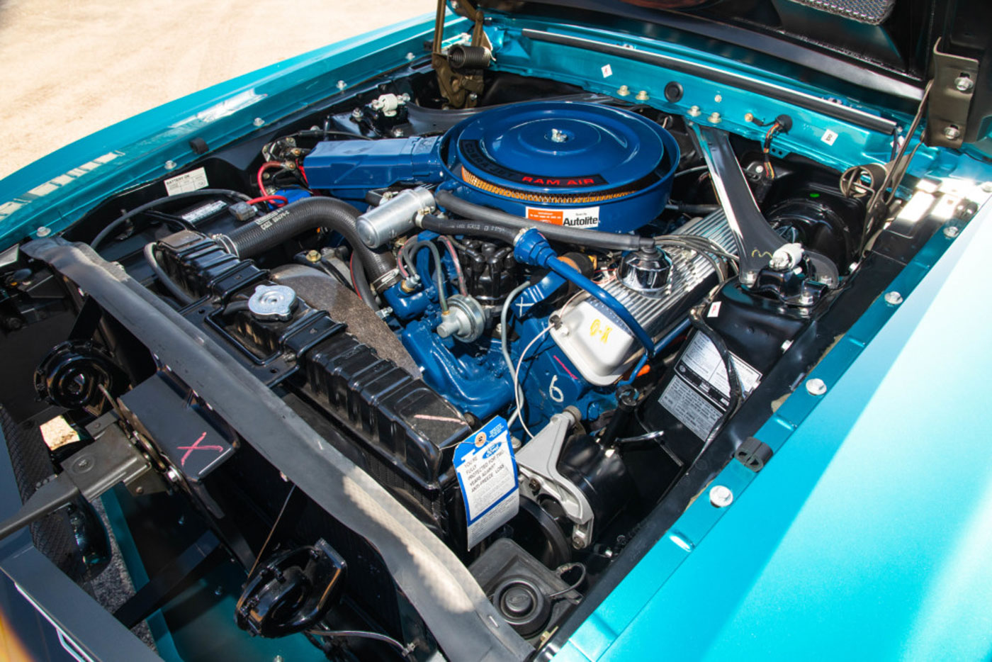 Inside, the also concours perfect interior features a full-length center console with oil pressure and ammeter gauges, plus switchgear for the fog lamps and interior lights, a wood-trimmed steering wheel and the correct genuine imitation wood applique on the dash, door panels and console. The integrated and padded roll hoop as factory-integrated surfboard hooks is perfect for holding the accompanying 1970 Harbor surfboard, which has been restored to match the GT500. There is no question by the 1970 model year nobody had to suffer for a lack of comfort inside a Shelby Mustang.