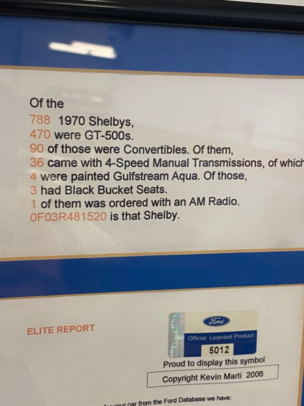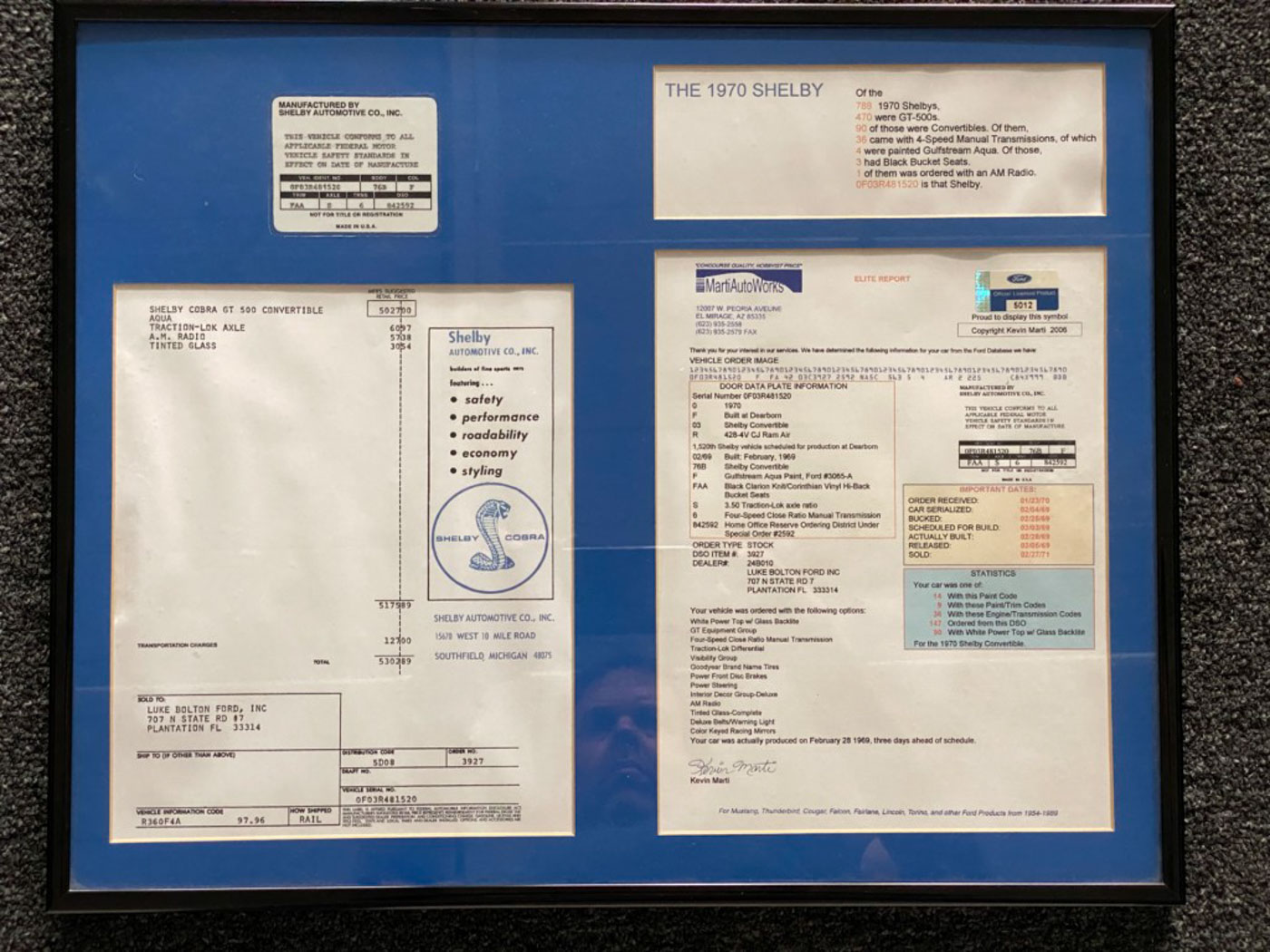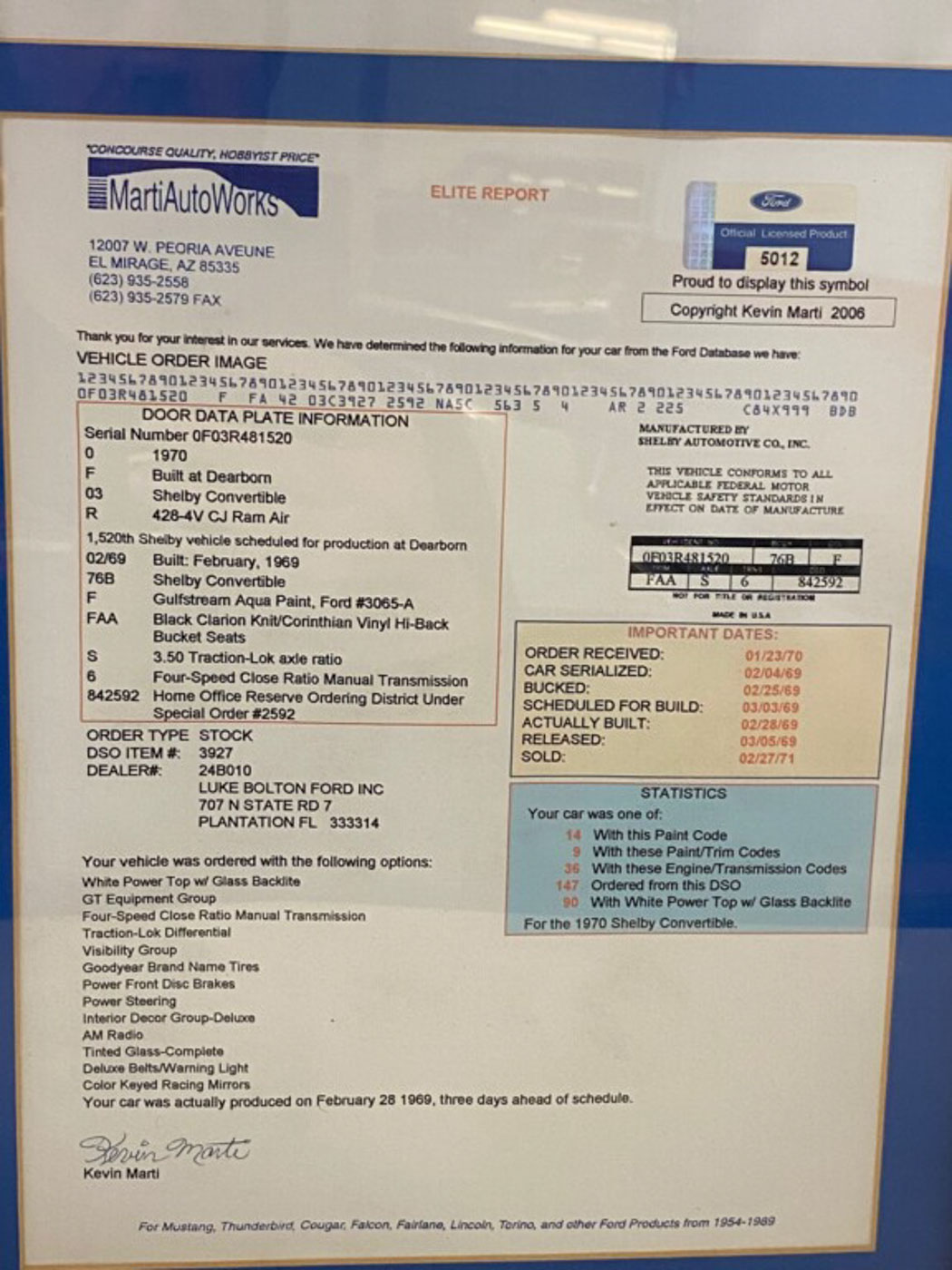 Documented both in the SAAC Registry and with its original Shelby factory invoice, original Shelby individual order form, and a framed Marti Autoworks Elite Report it has all of the right paper to back up what it is.