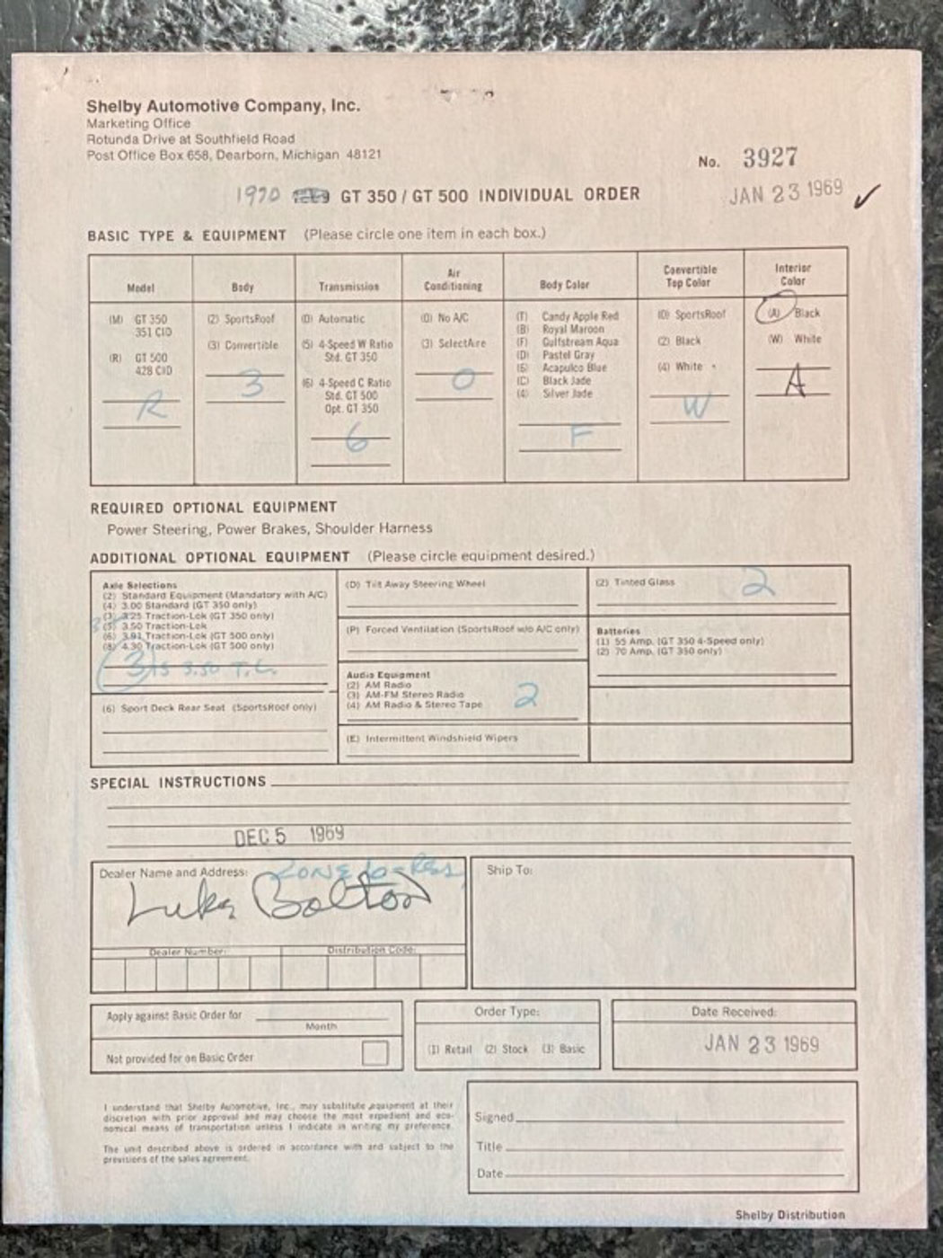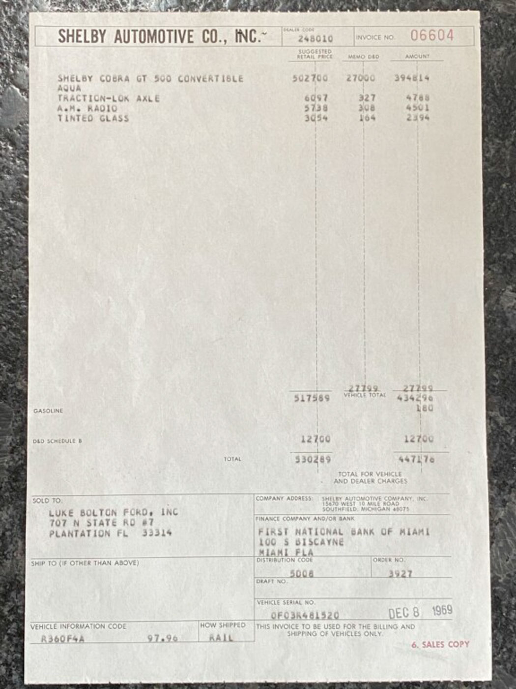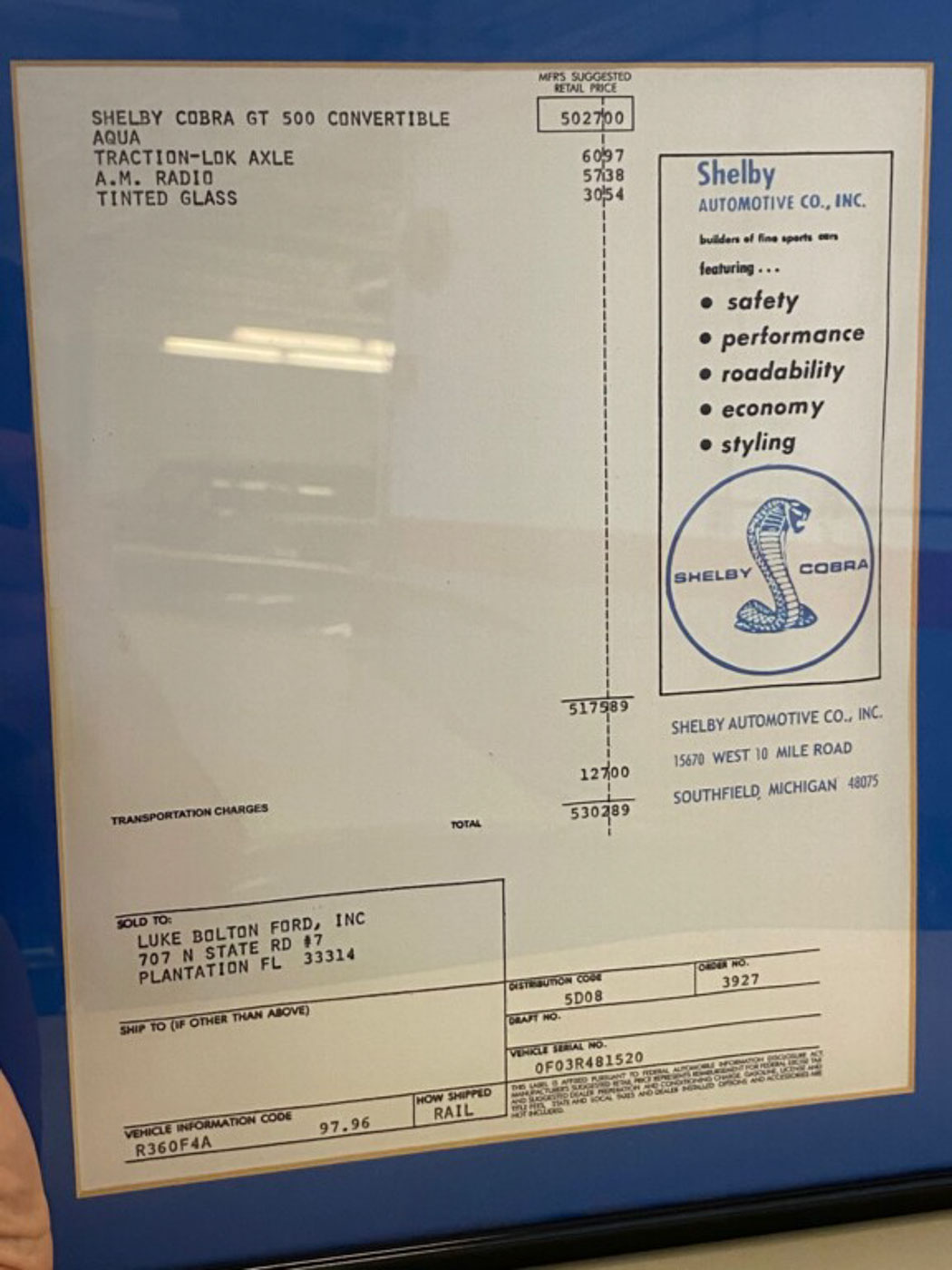 Documented both in the SAAC Registry and with its original Shelby factory invoice, original Shelby individual order form, and a framed Marti Autoworks Elite Report it has all of the right paper to back up what it is.