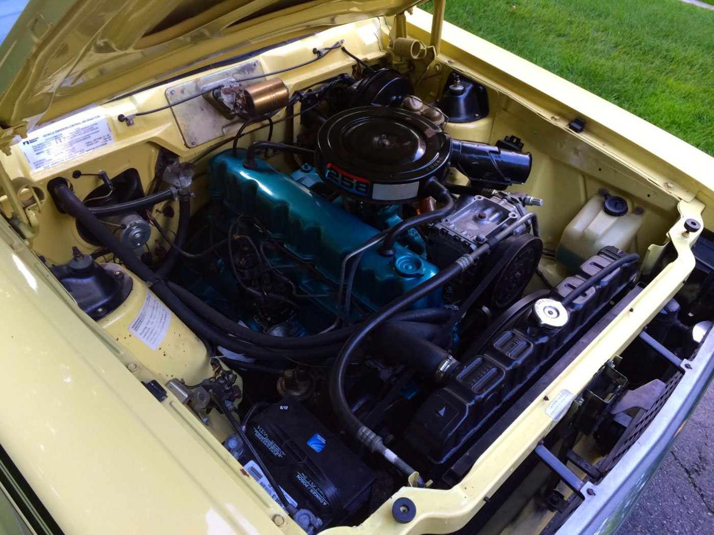 The Gremlin on offer here is one of those exceptions. A desirable 1972 model with the small bumpers it is also a 20,000 original mile, original paint, original interior time-capsule. It also has the optional “Big” 258 CID six-cylinder which is arguably AMC’s best engine ever- and certainly the same basic engine that was in production for decades in various forms. Behind the 258 is the optional Torque-Command automatic trans. Finished in yellow with black stripes, a two-tone interior, and Rally wheels the whole package is just slick. It also has the optional power steering, bucket seats and factory A/C which blows cold. As an example of its originality note the clear vinyl floor mats. They are original to the car and noted on the original purchase order!