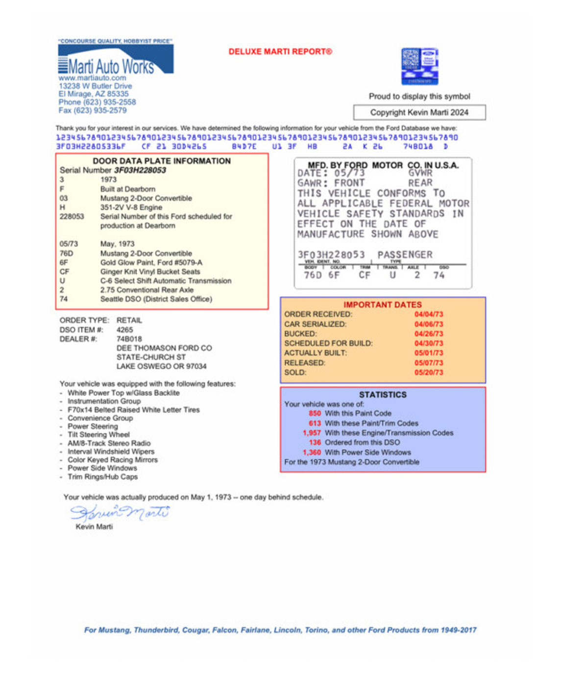 SOLD!- this incredible and extremely highly optioned 1973 Mustang Convertible that was the subject of an insane MCA Division 1 restoration using almost exclusively NOS parts! This car is certainly one of a kind and showcases the art of a truly proper restoration where everything looks, functions, feels, and even smells like new. As you know I love original, unrestored cars but as somebody who has restored cars for nearly 40 years I also fully appreciate the research, commitment, and skill it takes to achieve a result like this. And this car in particular simply blew my mind so I had to have it, and so did its new owner! Congrats, Steven A!