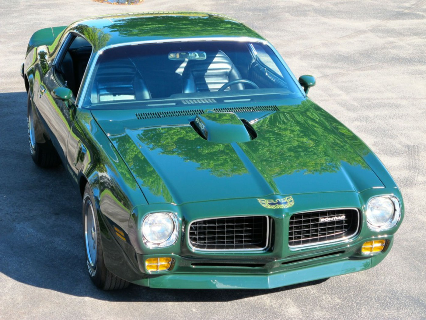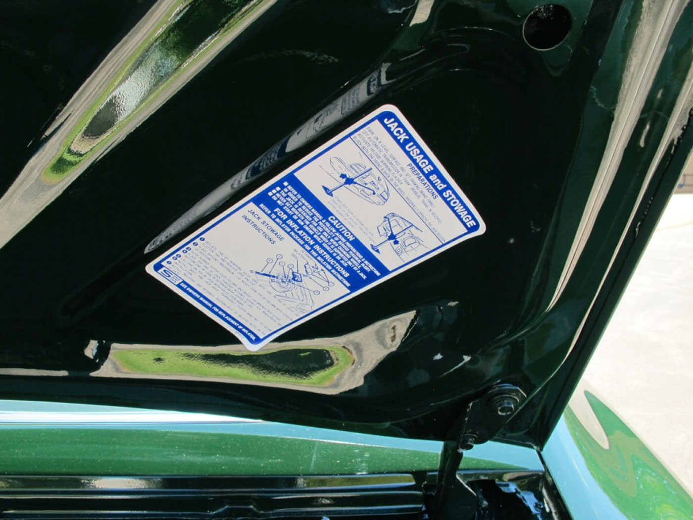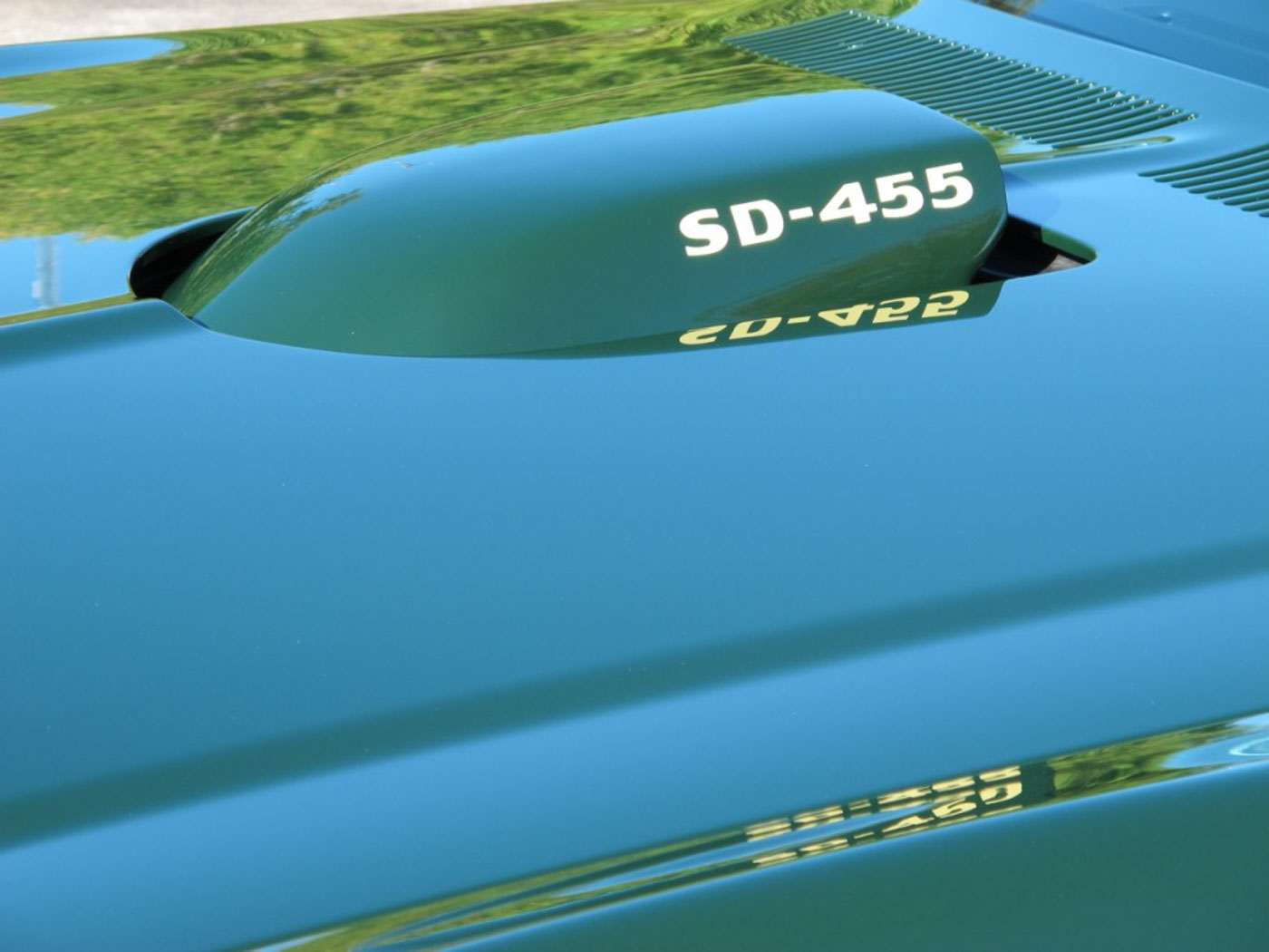 The Brewster Green paint is laser straight and was done in correct single-stage paint so it looks just as it would in 1973 with no variation of the proper Brewster Green hue due to clear coating, and it is also concours correct. Note the flatness of the panels, the reflections, and the panel fit. Also note the decals are the factory correct ones with the clear overlay. The photos here truly do not do the quality or the color justice.