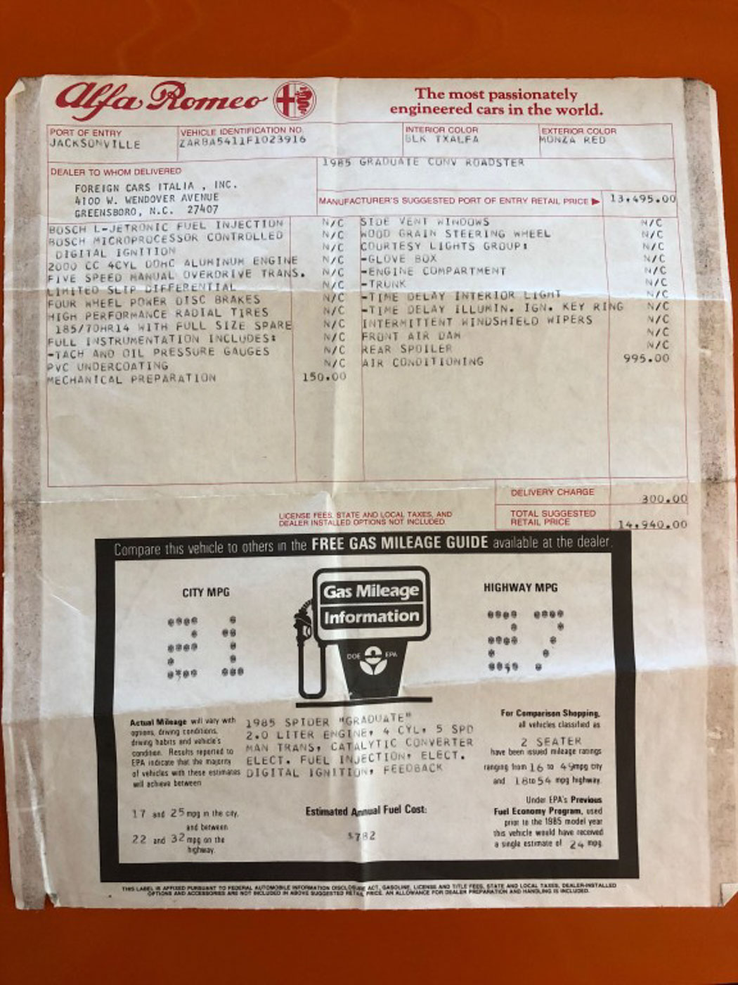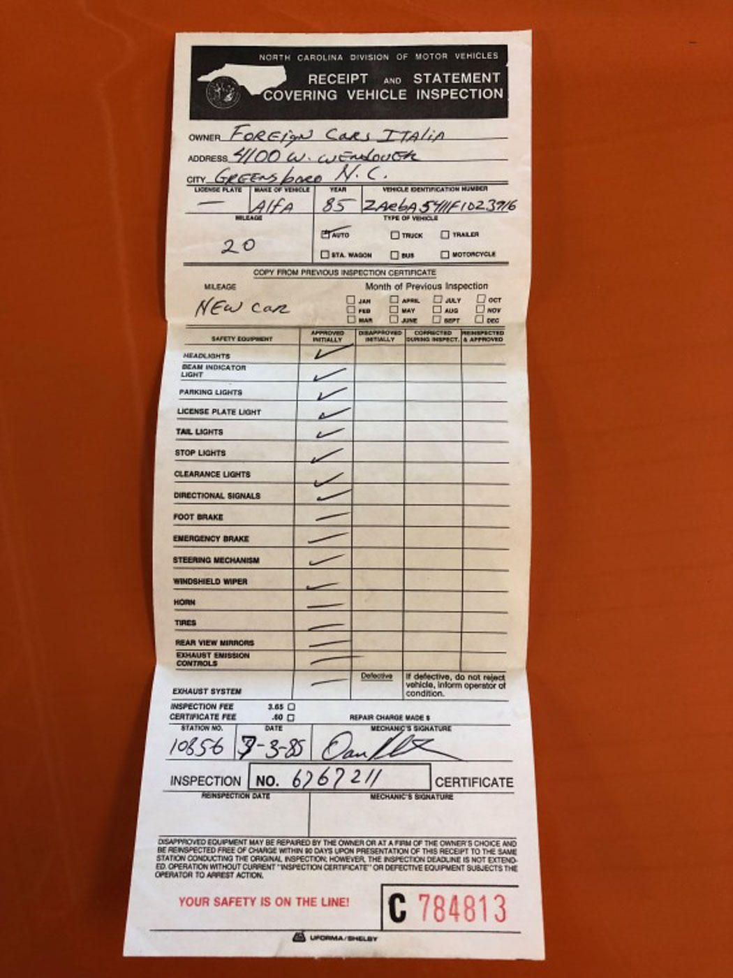 As you’d expect for a low-mileage car coming from its original owner this Graduate also retains its original window sticker, Alfa Romeo Pre-Delivery Inspection Form, North Carolina DMV Inspection Receipt, Odometer Mileage Statement, Transport Receipt and even the receipt from the original check used to purchase the car in 1985.