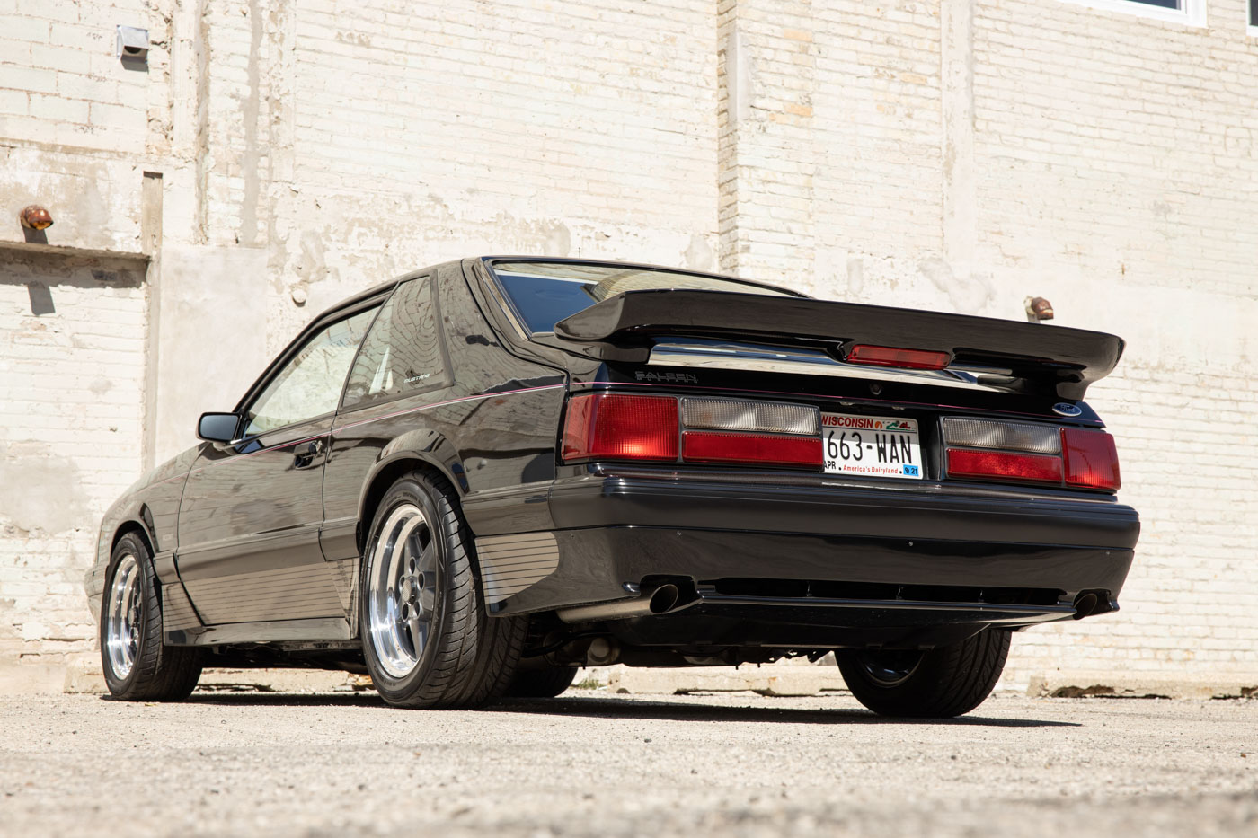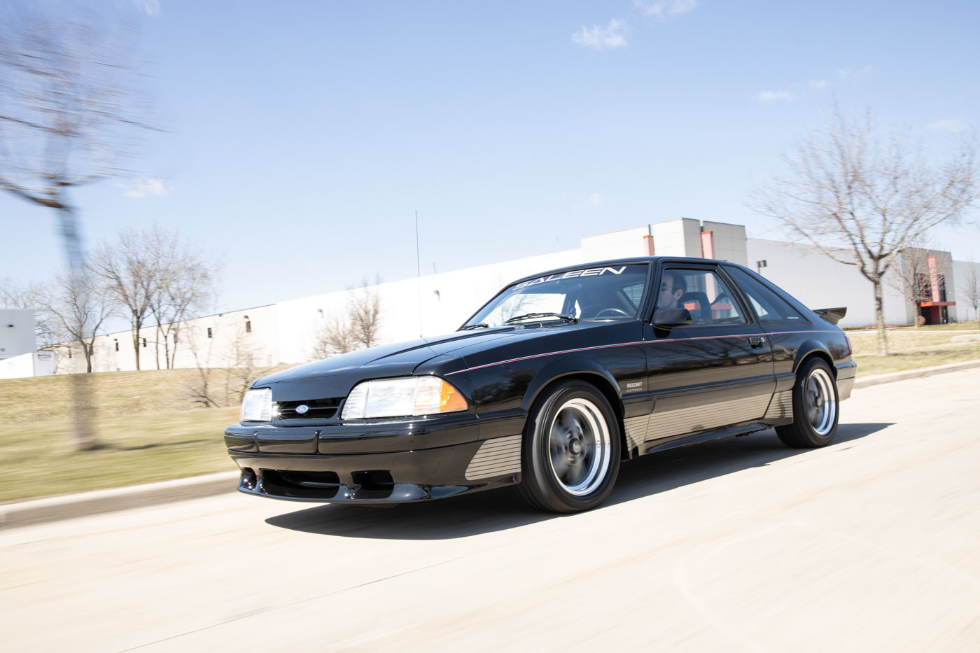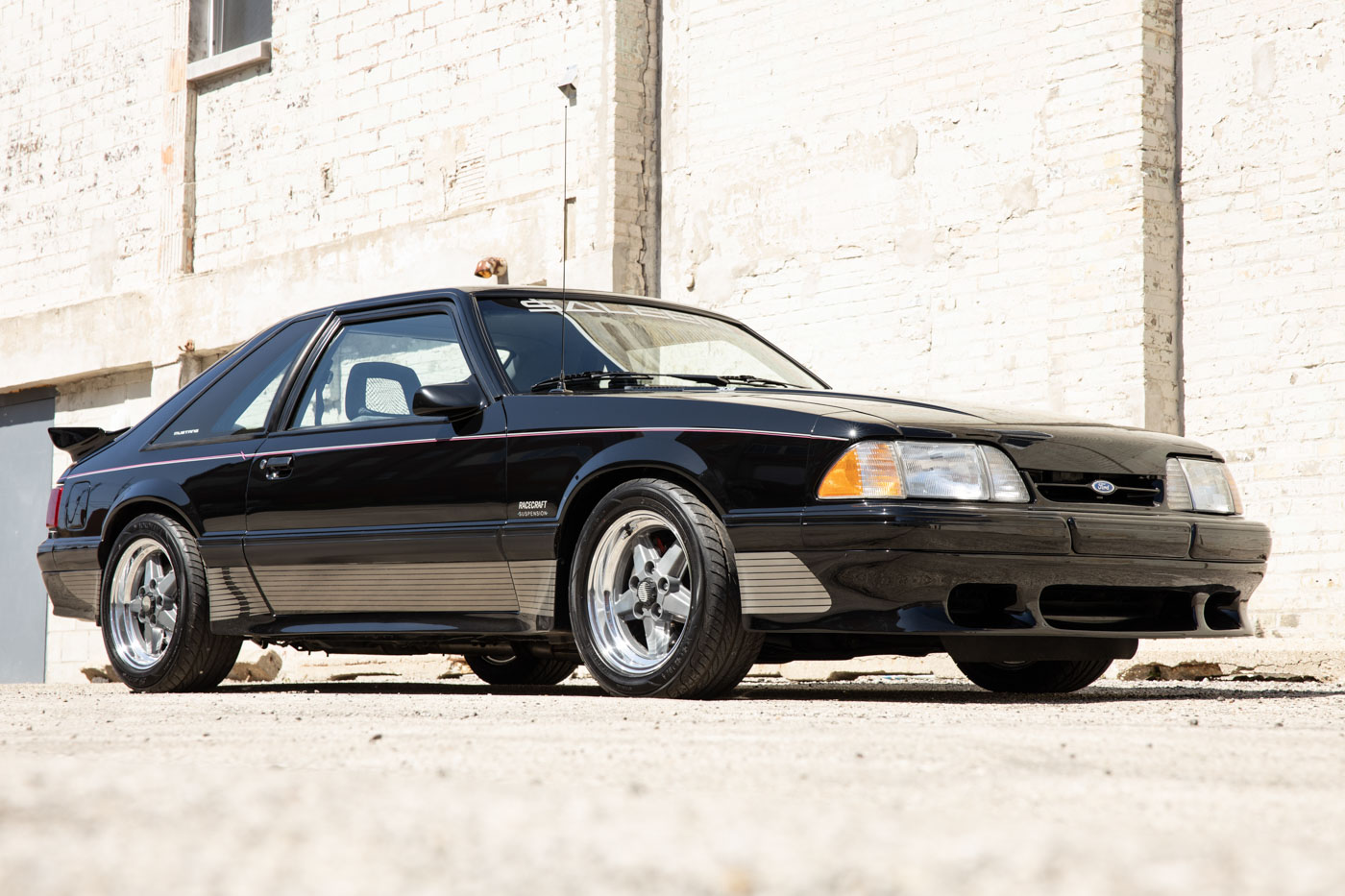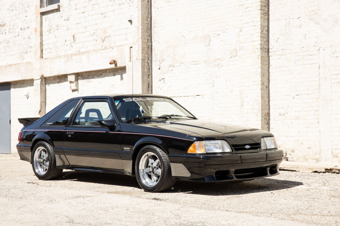 It was instantly identifiable by its tri-color body-side racing stripes, Saleen Autosport designed front air dam, extended rear spoiler and body-side skirts, Saleen Mustang windshield tint band and decklid emblem, Ford Motorsport quarter window graphics and unique Saleen Autosport/American Racing alloy wheels. Its Racecraft suspension offered serious handling improvements through the use of special chassis bracing, a strut tower brace, special high-rate front and rear springs, Monroe Formula GP front struts, rear shocks and horizontal axle damper, special strut mounting bearings, urethane sway bar bushings and SVO 4-wheel disc brakes.