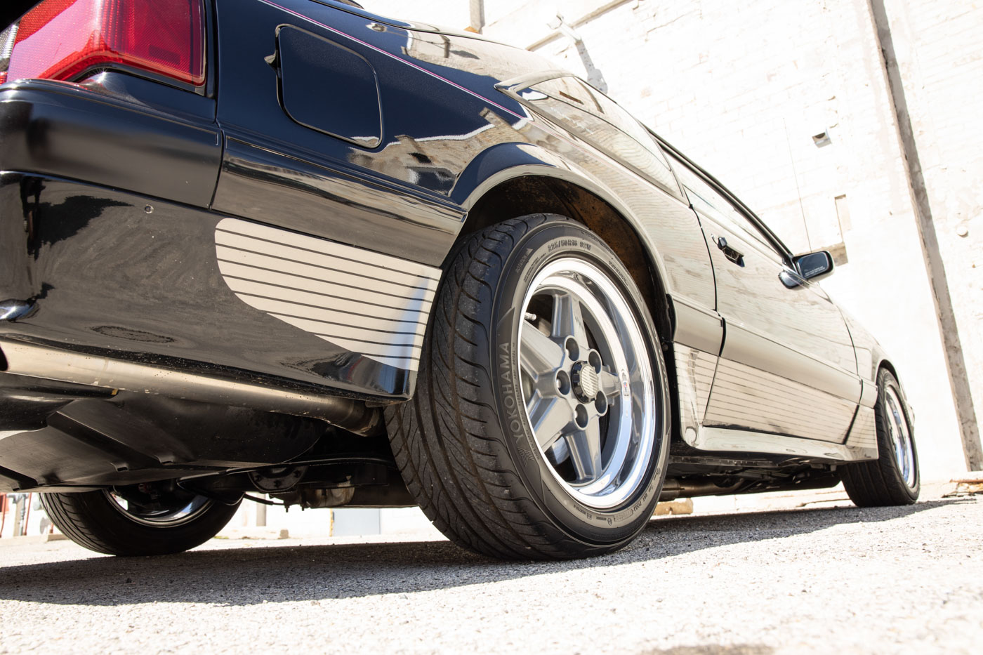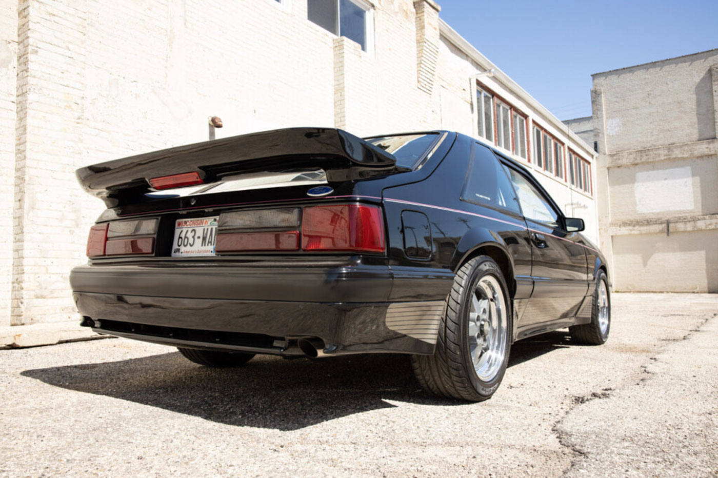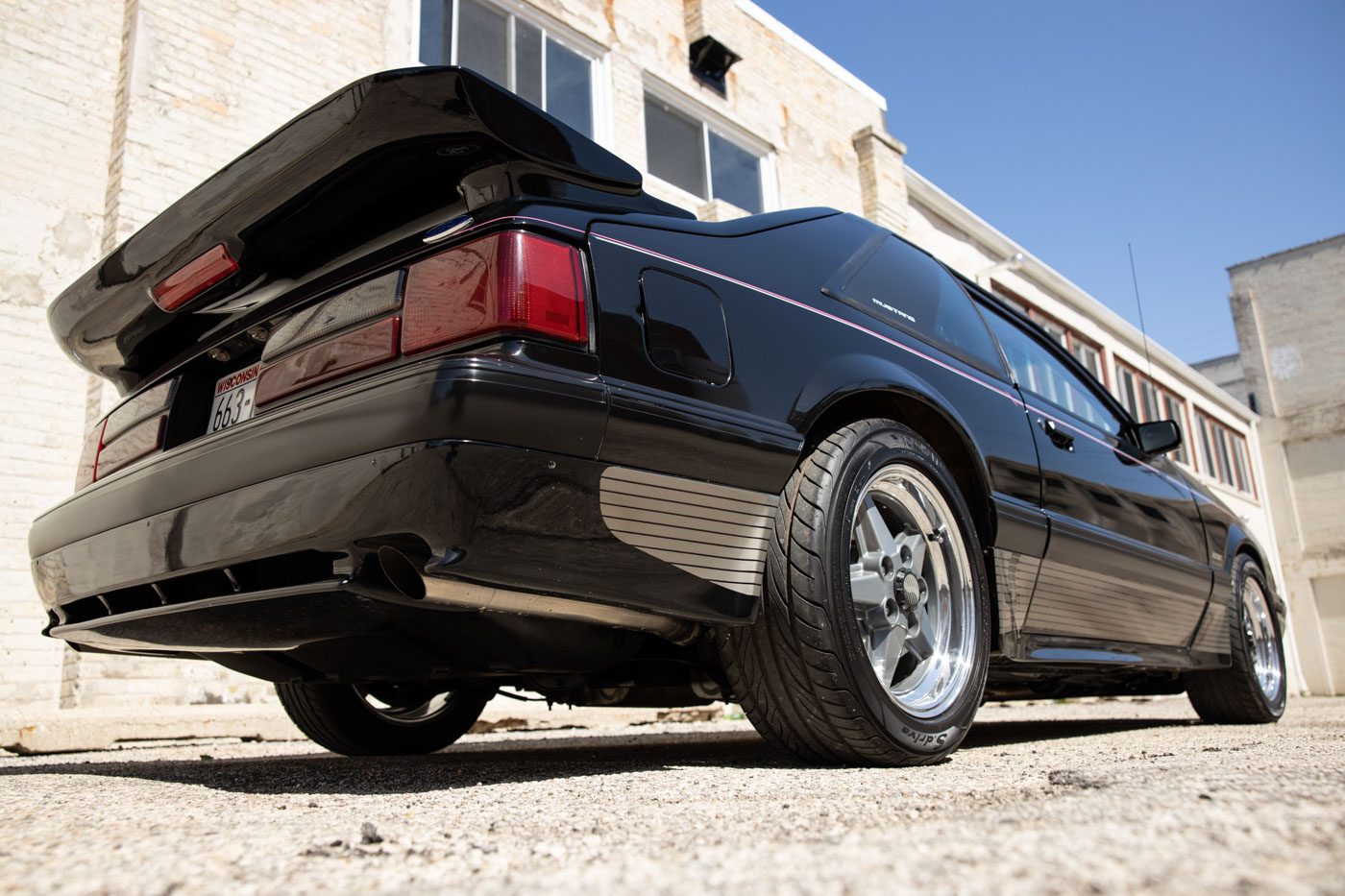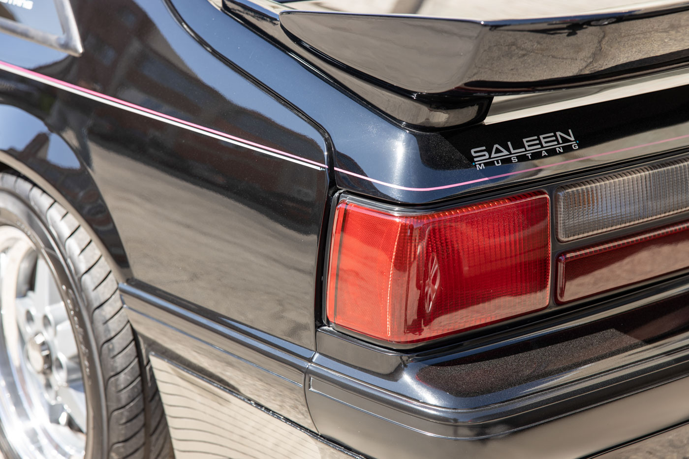 It was instantly identifiable by its tri-color body-side racing stripes, Saleen Autosport designed front air dam, extended rear spoiler and body-side skirts, Saleen Mustang windshield tint band and decklid emblem, Ford Motorsport quarter window graphics and unique Saleen Autosport/American Racing alloy wheels. Its Racecraft suspension offered serious handling improvements through the use of special chassis bracing, a strut tower brace, special high-rate front and rear springs, Monroe Formula GP front struts, rear shocks and horizontal axle damper, special strut mounting bearings, urethane sway bar bushings and SVO 4-wheel disc brakes.