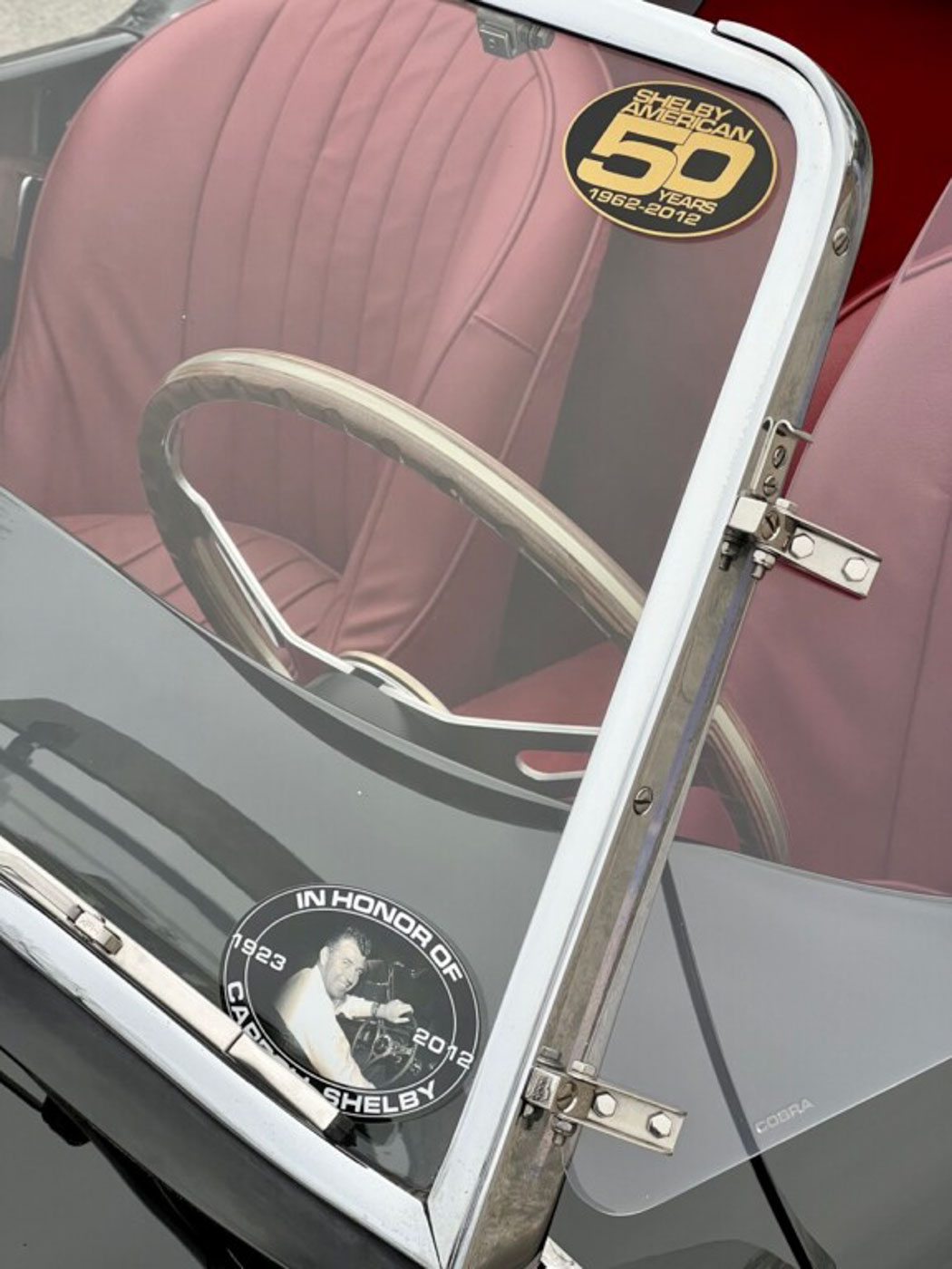 The car’s tube frame that holds the 289-cid V-8 engine and four-speed manual transmission, also houses a Shelby aluminum housing differential, uprated four-wheel disc brakes and Spicer half-shafts. The cockpit features Stewart Warner gauges, tinted windscreen visors, leather-covered dash and map pockets, unique 50th Anniversary floor mats, Shelby harnesses and wood steering wheel with a limited edition horn button. The front grille is instantly recognizable, and the car looks ready for action with front and rear bumpers, wind wings, chrome 15-inch wire wheels and unique front, rear and side 50th Anniversary badging that is finished in a gold tone.