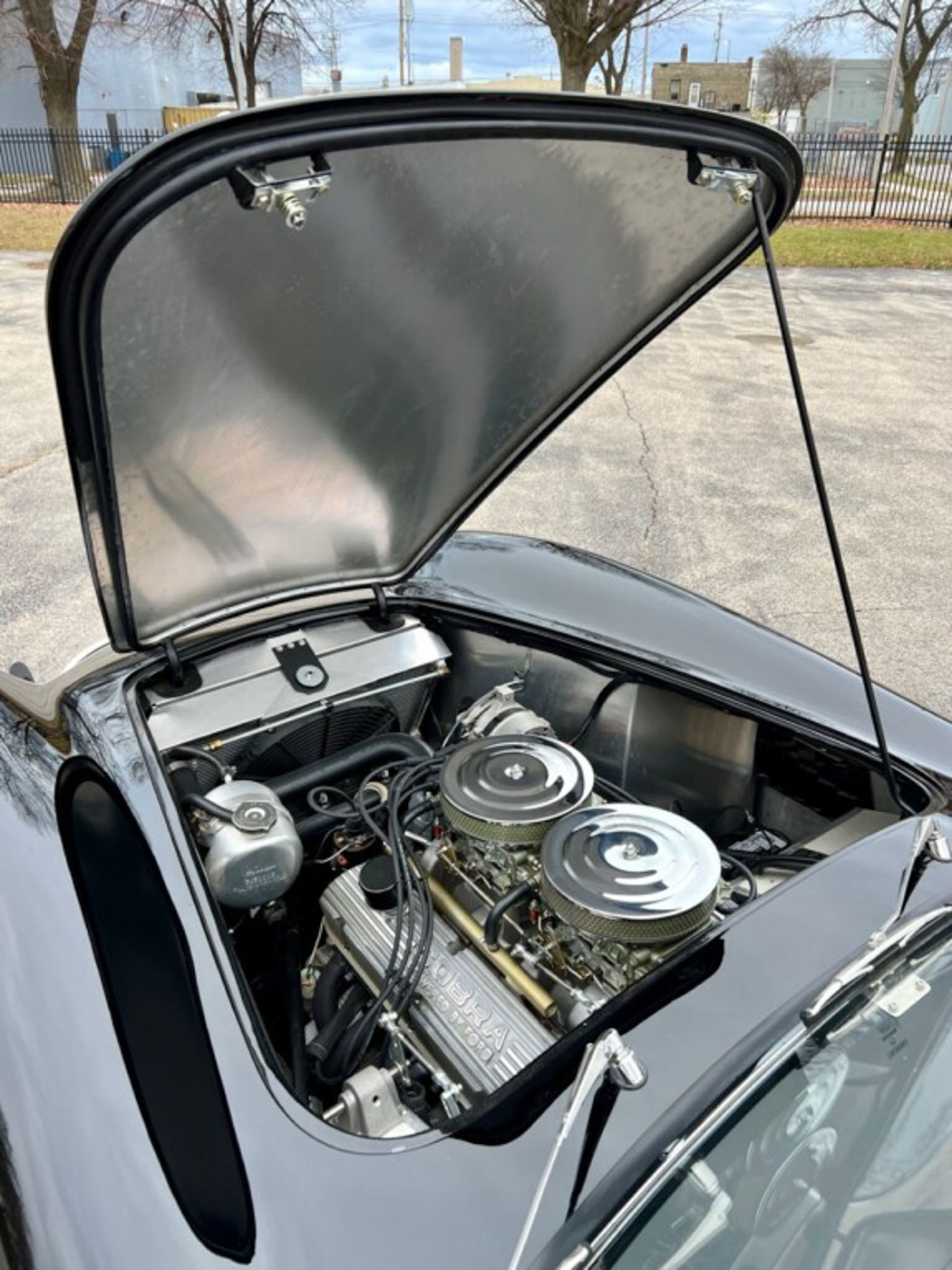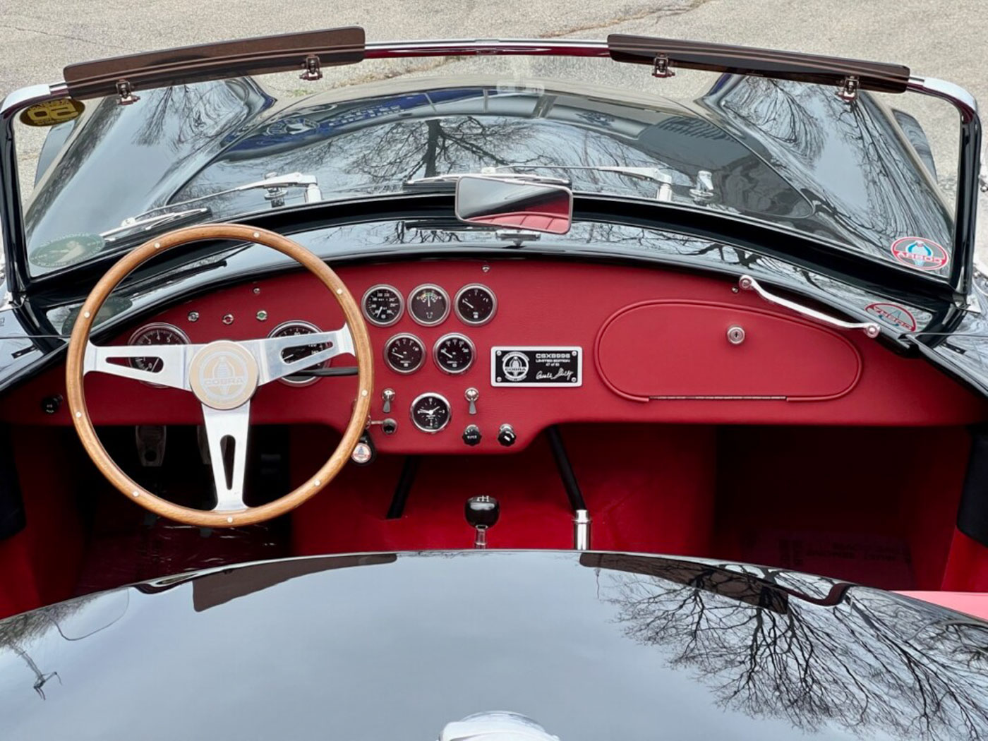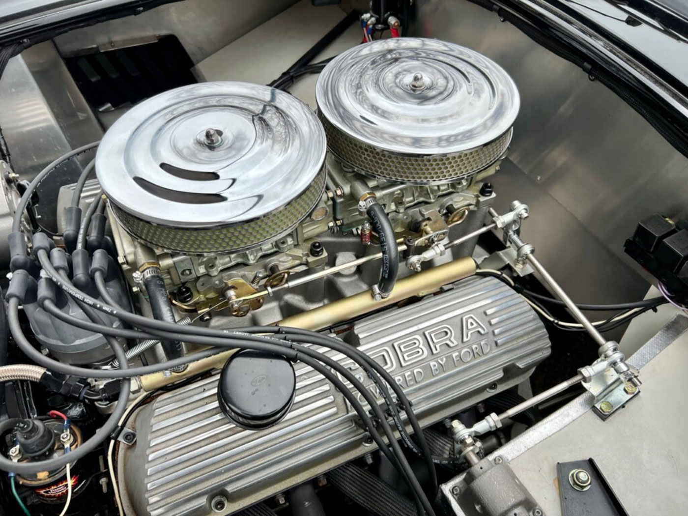 This particular car is CSX8996 and number 47 of the 50 cars, but more importantly is one of only five aluminum bodied 50th Anniversary cars. It is was assembled with a reported NOS 289-cid HiPo engine fitted with two four-barrel Holley carburetors on a Shelby intake, plus Cobra cast aluminum valve covers and Cobra Roadster oil pan. The trans is an NOS Top Loader four-speed with proper period-correct shifter. It is stated that this particular Shelby is one of the two 50th Anniversary cars built that are “as close to an original 289 Cobra as one can get.” After the initial build the current owner sent it here to CCA to have it further dialed in, at a cost of over $10,000, to a period-correct look encompassing proper ride height, chassis tuning, Michelin XWX tires, and making sure every aspect of the car was spot on and ready to deliver the true 289 Cobra experience.