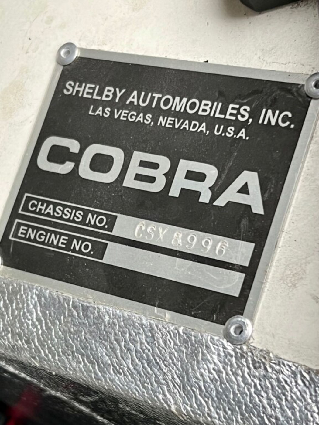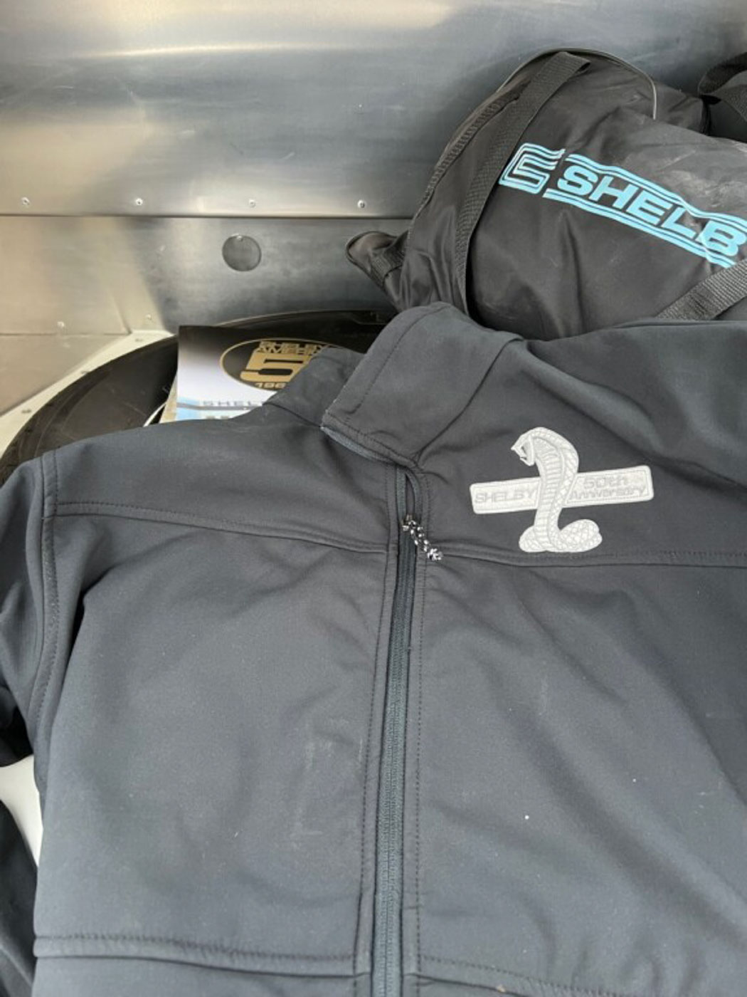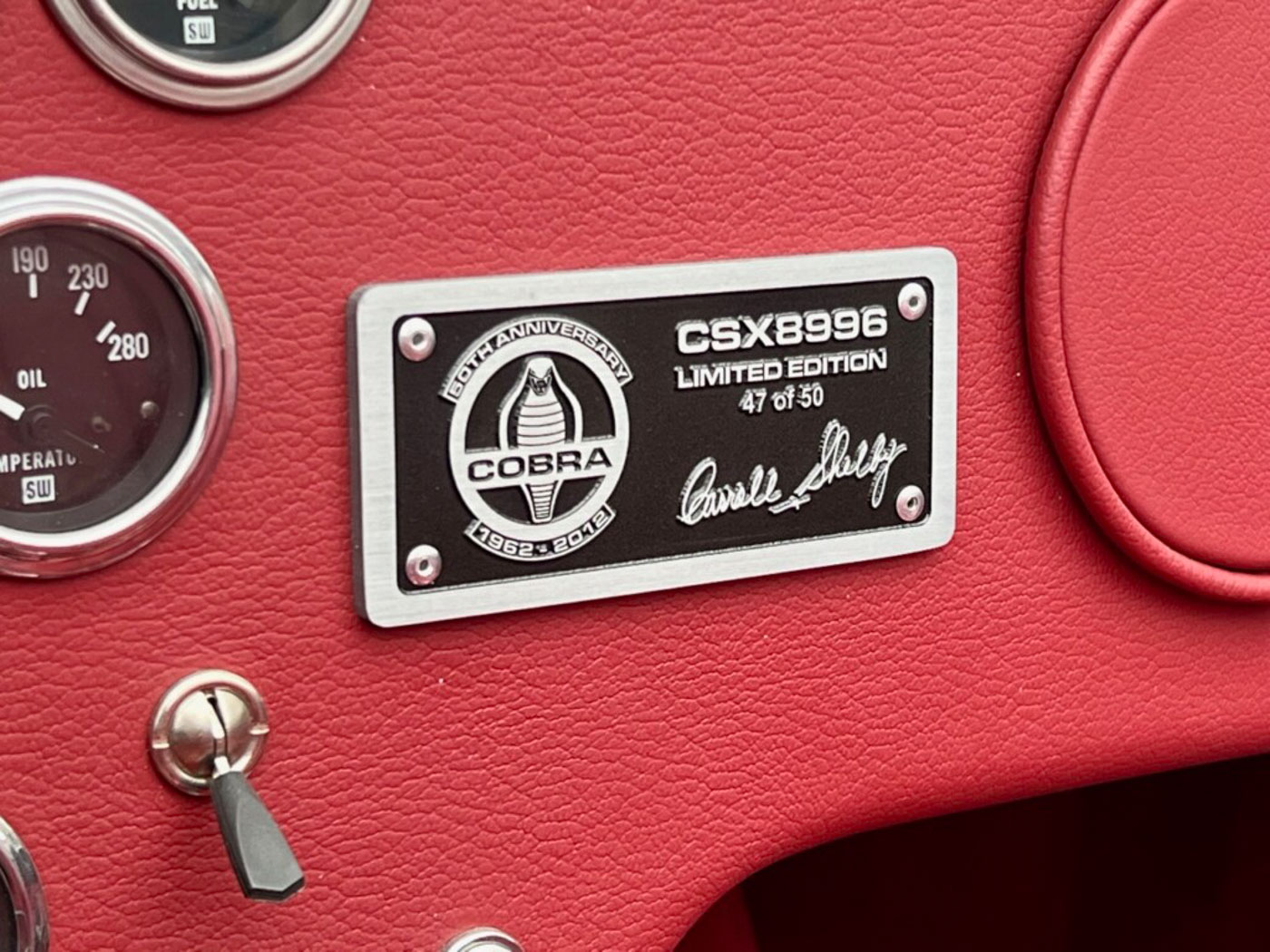 Also accompanying this Cobra is a factory special edition 50th Anniversary car cover; offered only with this edition of car. It also has its VIN of CSX 8996 and #47 of 50 sequence number on a plate from Shelby American on the dash. The sale also includes the original 50th Anniversary Cobra jacket, a complete build and history book, all factory documentation and brochures, plus a model of the car and an enameled tin sign with the 50th Anniversary Cobra memorialized on it.